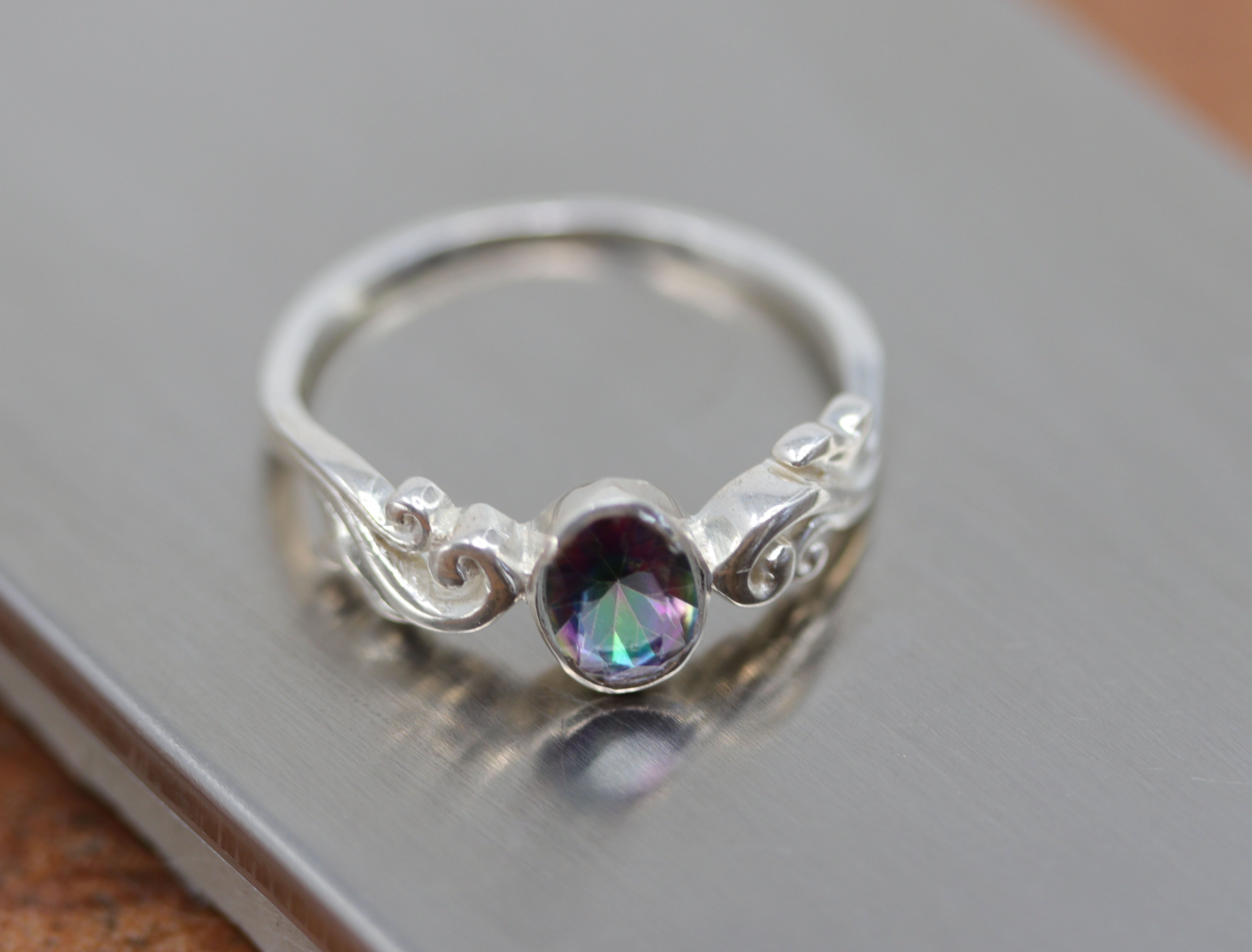 A beautiful Southwest Style gemstone ring made from sterling silver and mystic topaz. The ring size is 9 and it is about 3/8" in length. This item is not Native American.
