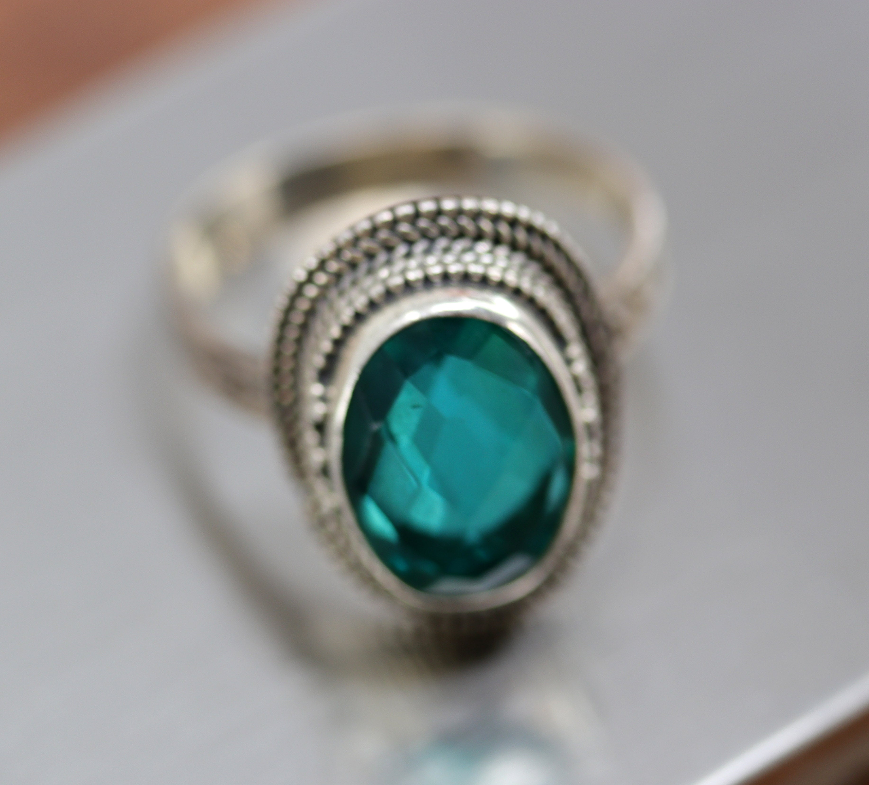 A beautiful Southwest Style gemstone ring made from sterling silver and mystic topaz. The ring size is 10 and it is about 7/8" in length. This item is not Native American.
