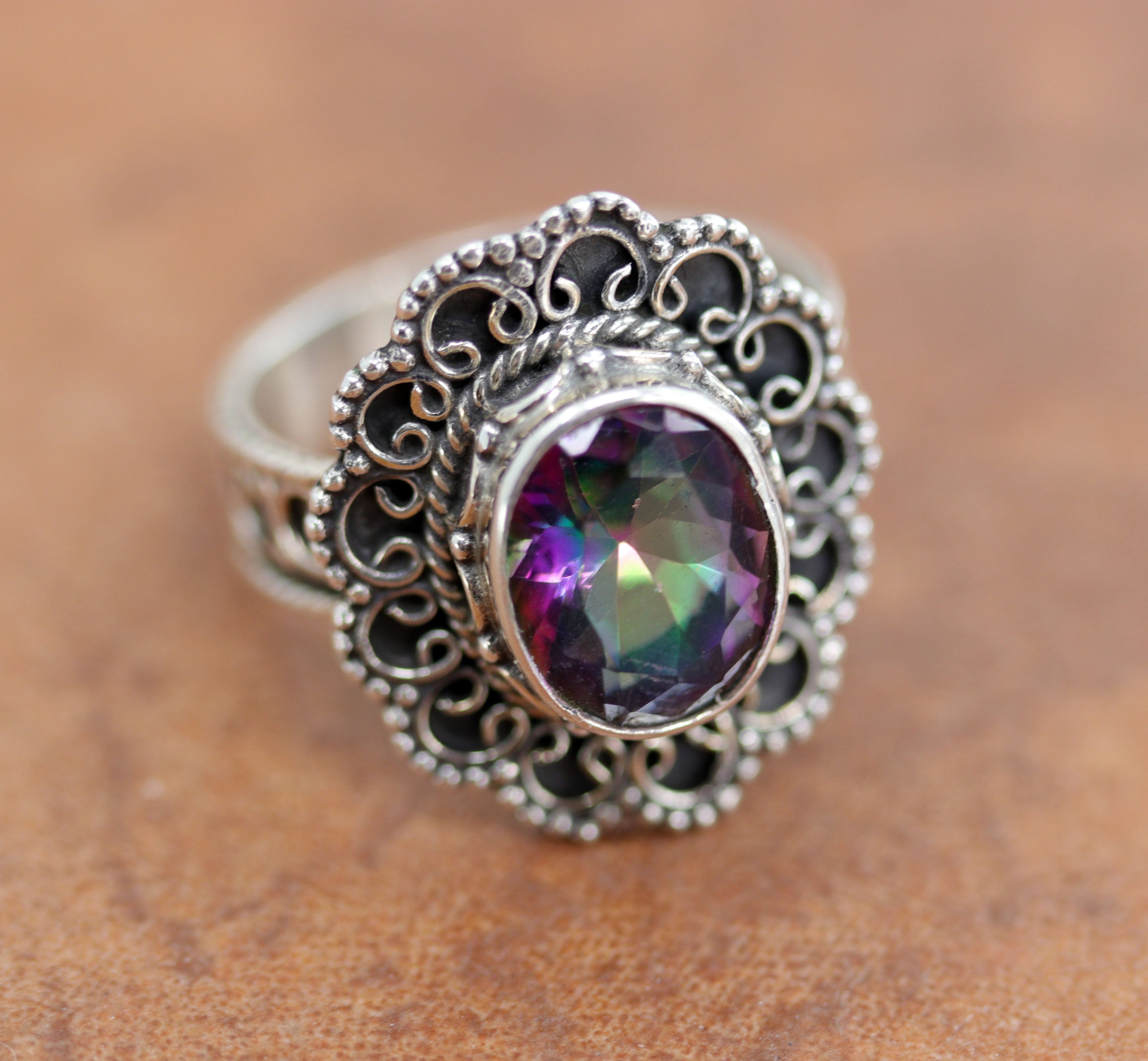 A beautiful Southwest Style gemstone ring made from sterling silver and mystic topaz. The ring size is 5 1/2 and it is about 7/8" in length. This item is not Native American.