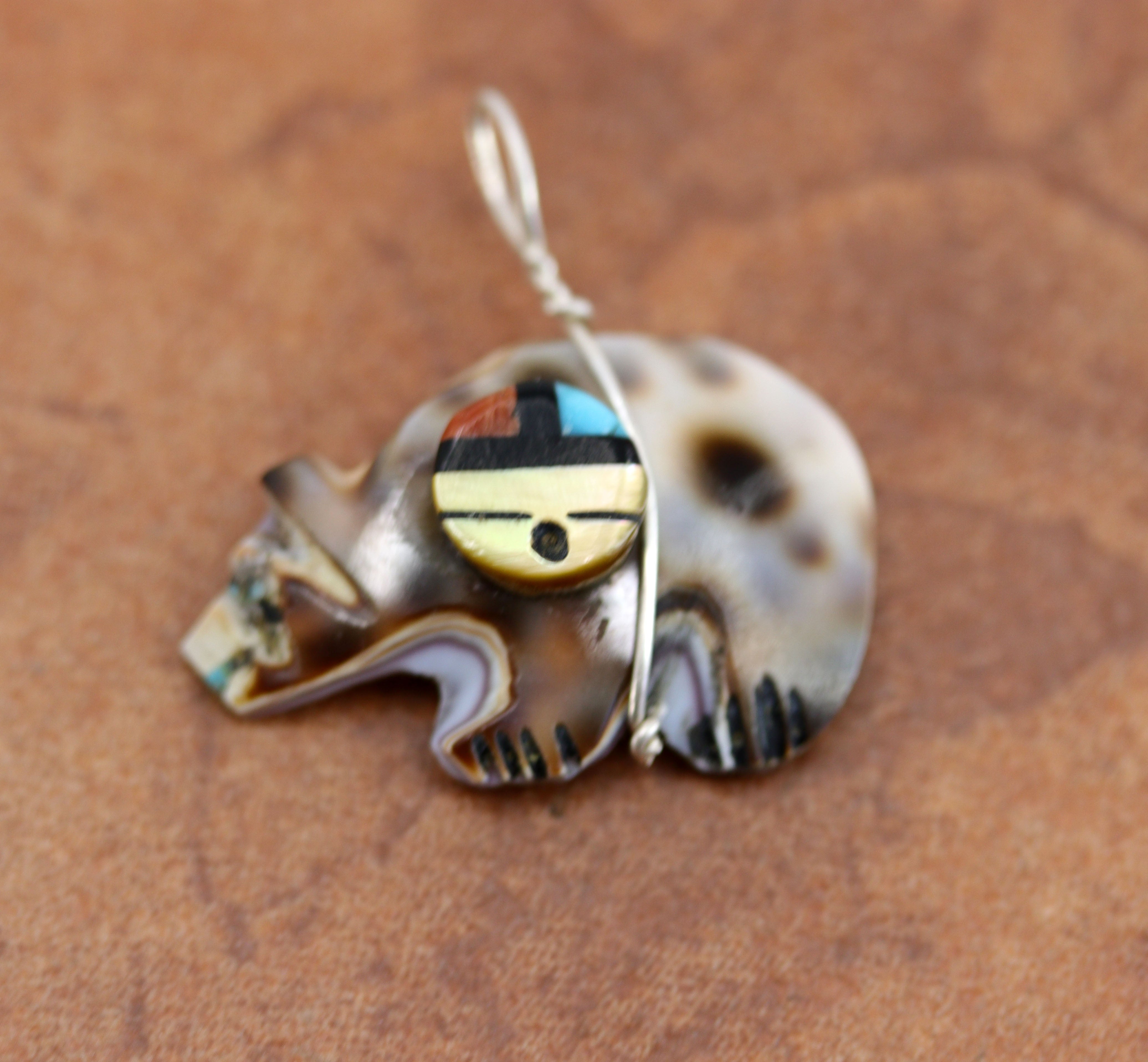 A beautiful Zuni Native American Pendant. It is made from sterling silver. It is about 1 1/4" in length including the bail and 1 1/8" in width.