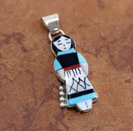 A Beautiful Zuni Native American Maiden Pendant. It is made from sterling silver and multi-stone inlay. It is 2" in width and 5/8" in length.