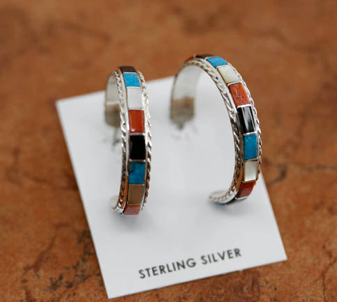 Brand new, very nice, Native American earrings. They are made from sterling silver and multi-stone inlay. The earrings are about 1 3/8" in length and 1/4" in width.