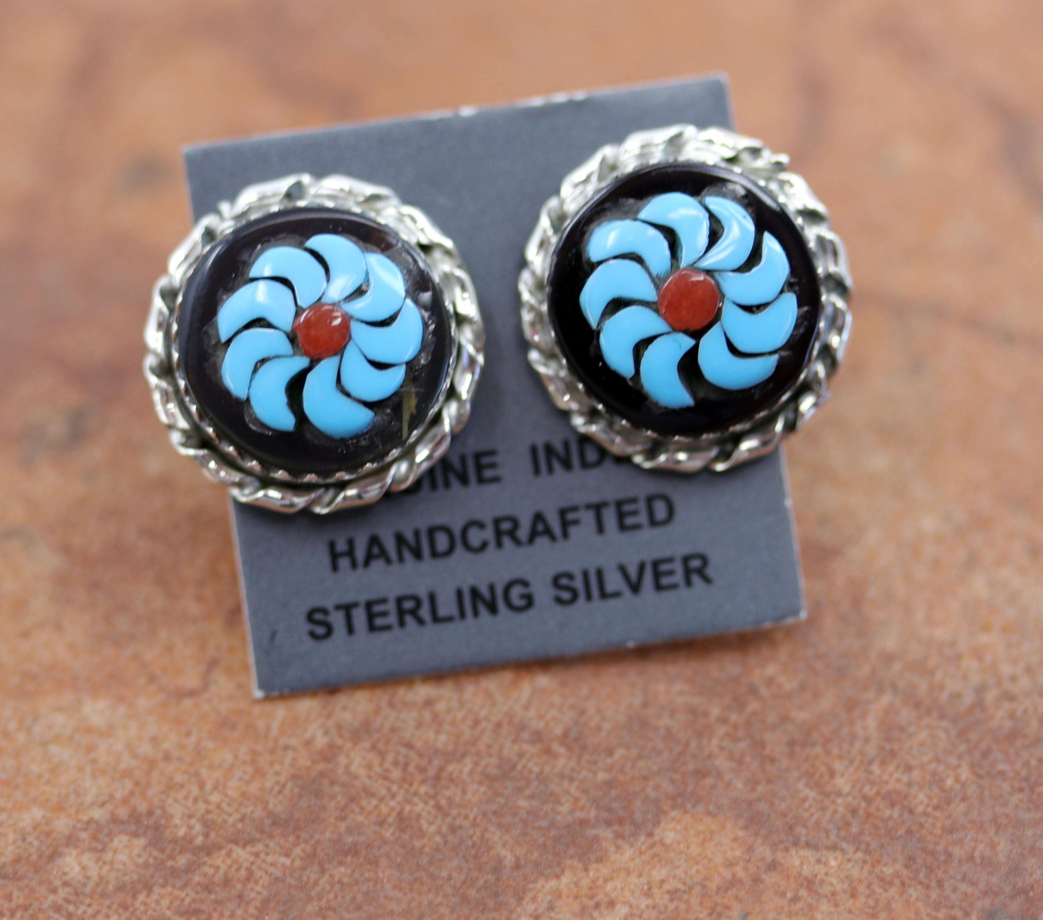 Beautiful Zuni Native American earrings. They are made from sterling silver and multi-stone inlay. Each earring is 5/8" in diameter.