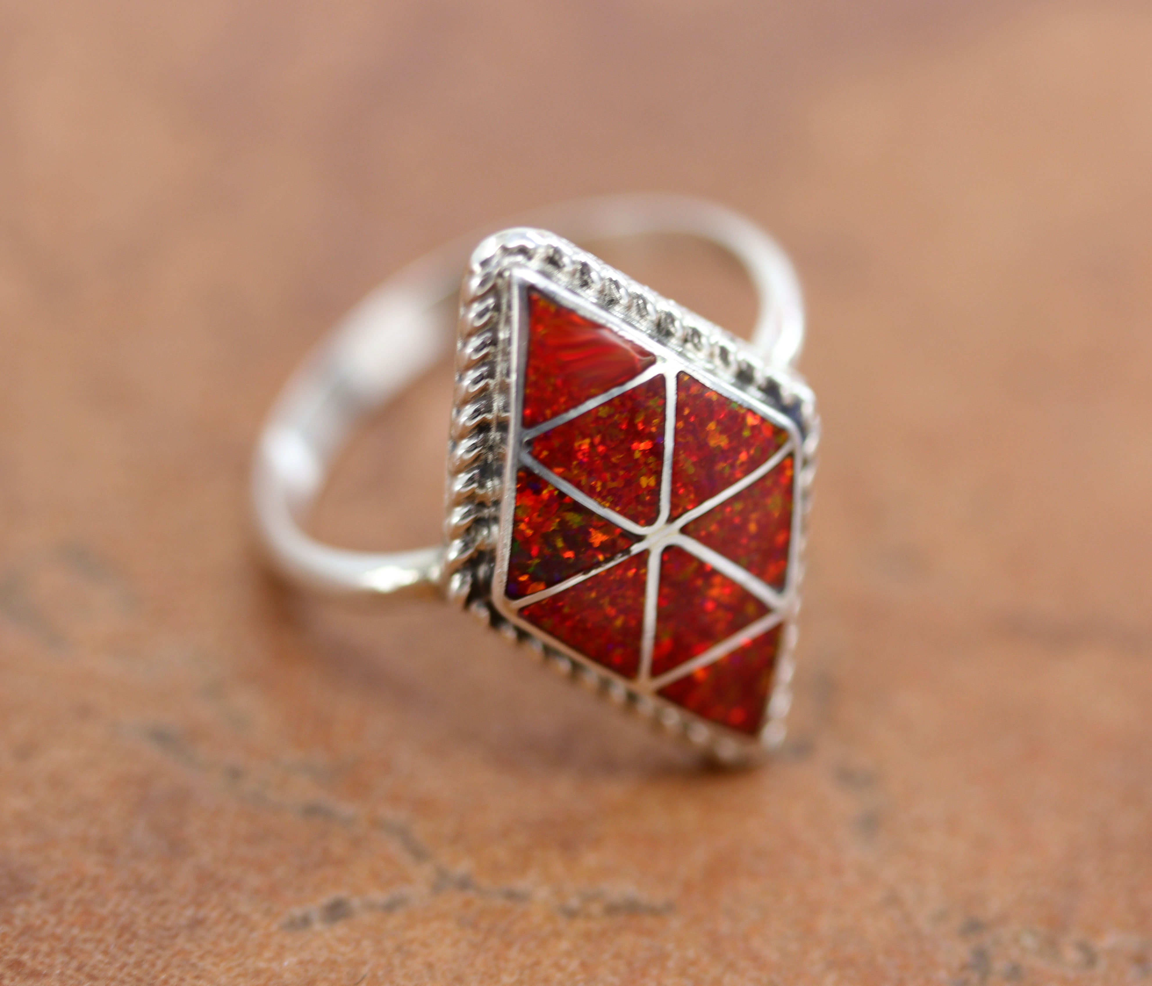 Zuni Silver Red Created Opal Ring Size 5 1/2