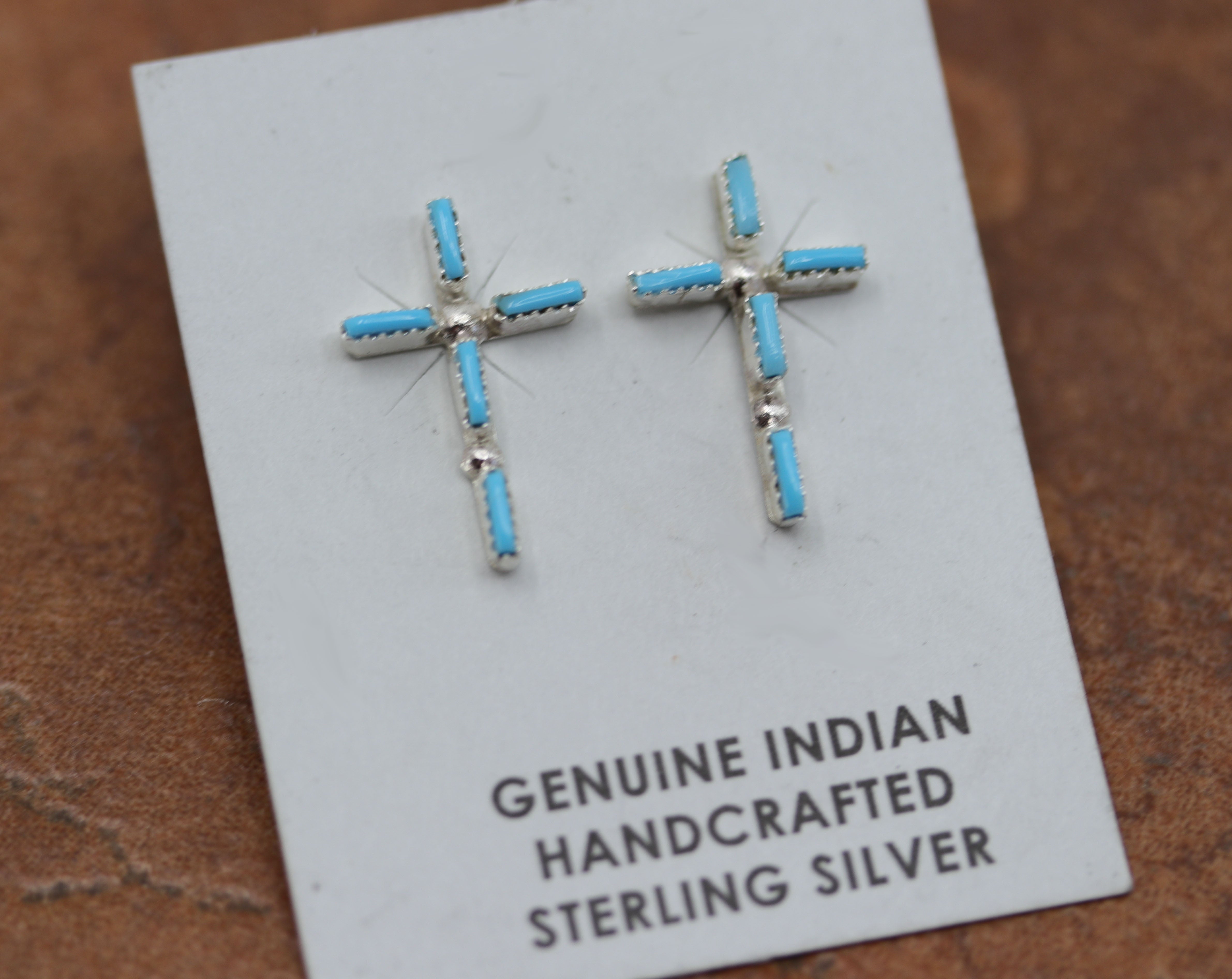 Beautiful Zuni Native American Cross earrings. They are made from sterling silver and turquoise. Each earring is 1" in length, and about 3/4" in width.