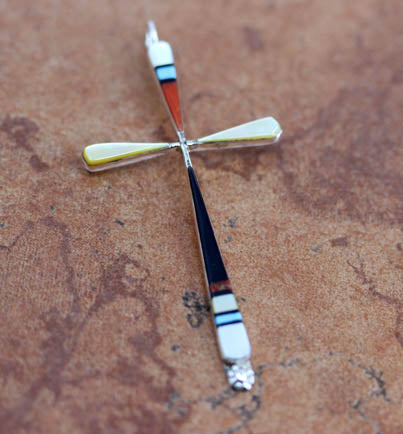 An authentic Zuni Native American Pendant. It is made from sterling silver and multi-stone inlay. It is about 2 5/8" in length including the bail, and about 1 1/4" in width. Please allow a slight difference in the stone colors.