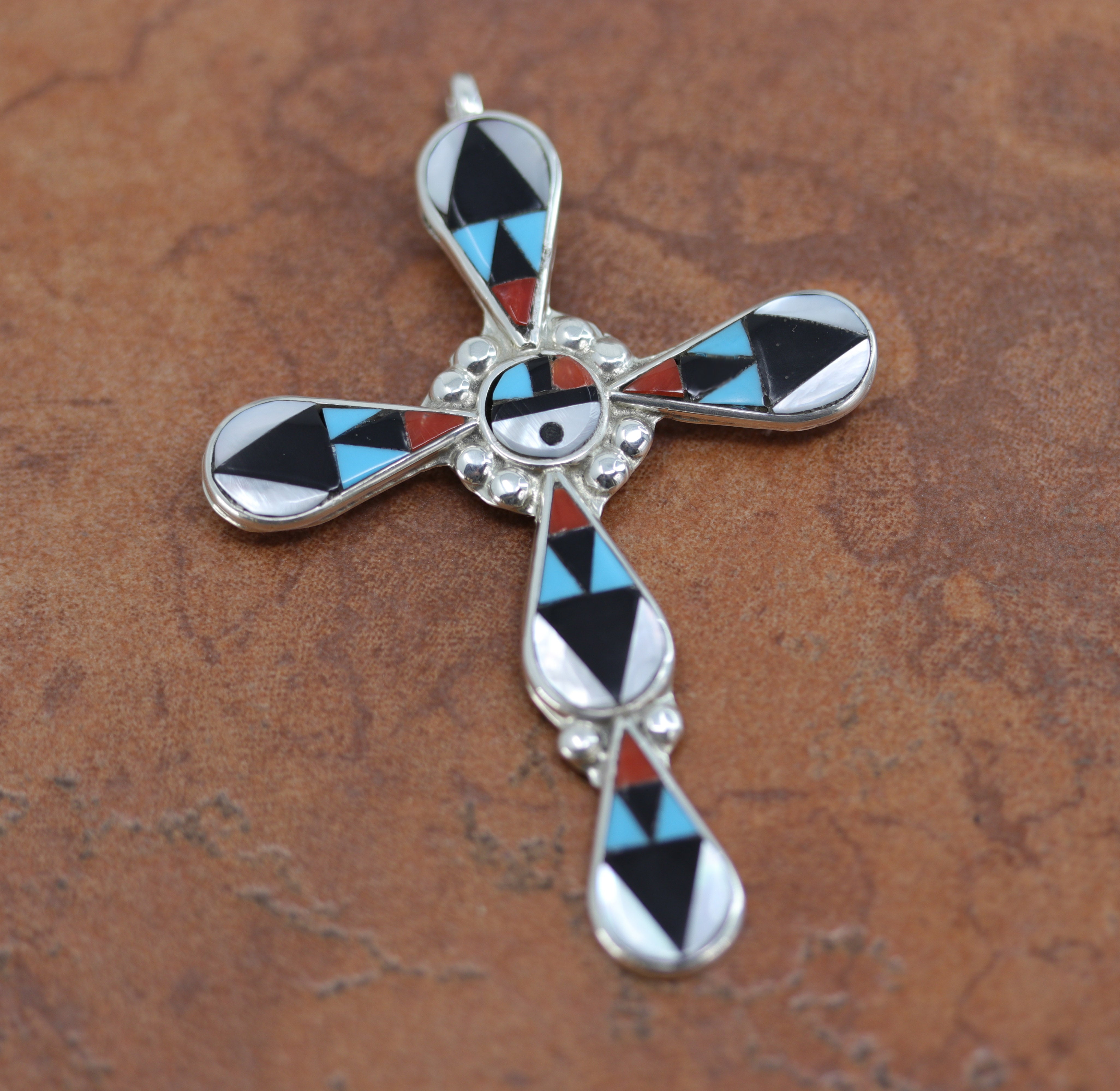 A lovely, authentic Zuni Native American Pendant. It is made from Sterling Silver and multi-stone. It is about 3" in length including the bail, and about 2" in width.
