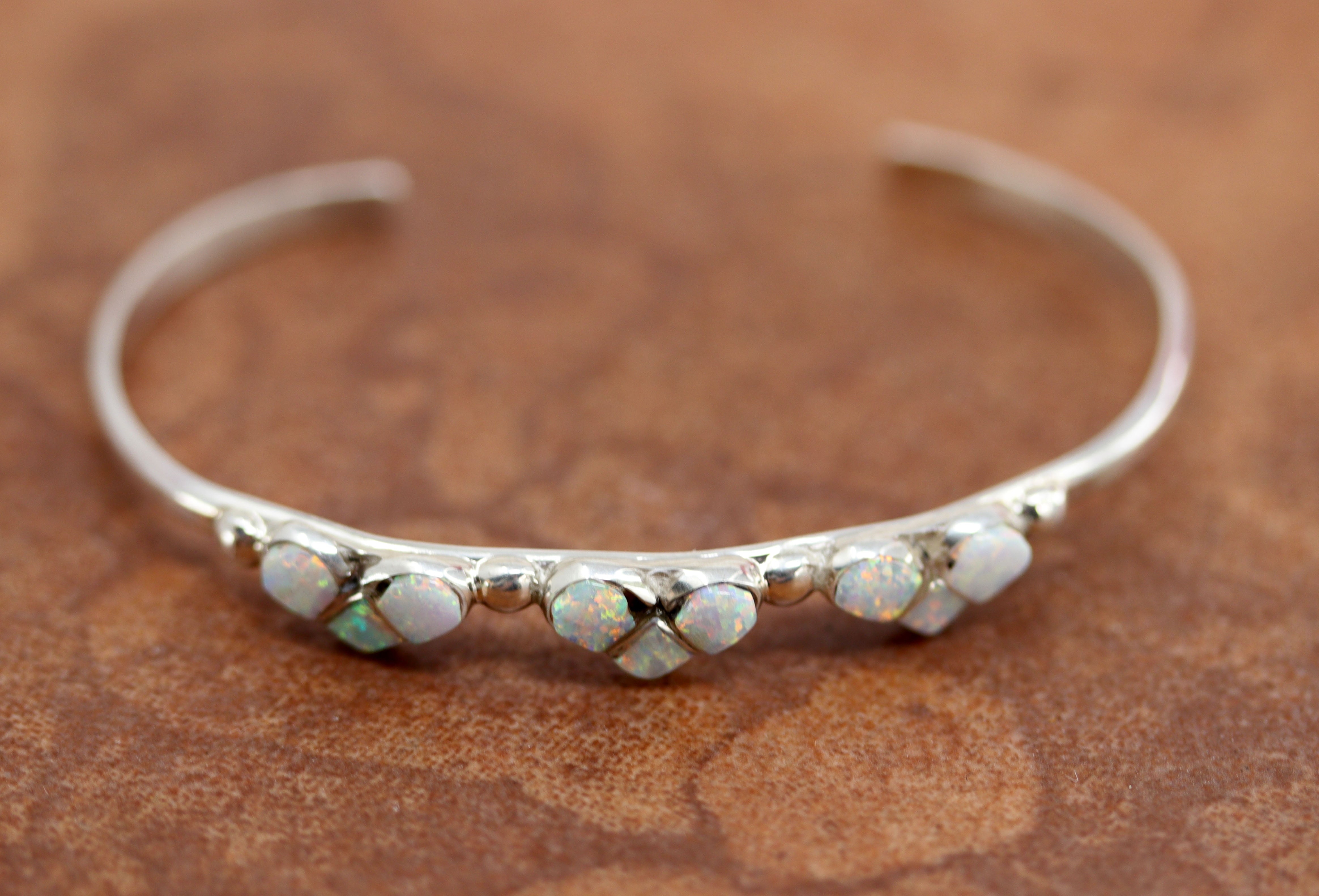 Beautiful Zuni Native American bracelet. It is made from sterling silver and created opal. It is about 3 3/4" around and about 1/4" wide at the widest point. The opening is about 1 1/8", and partly flexible.