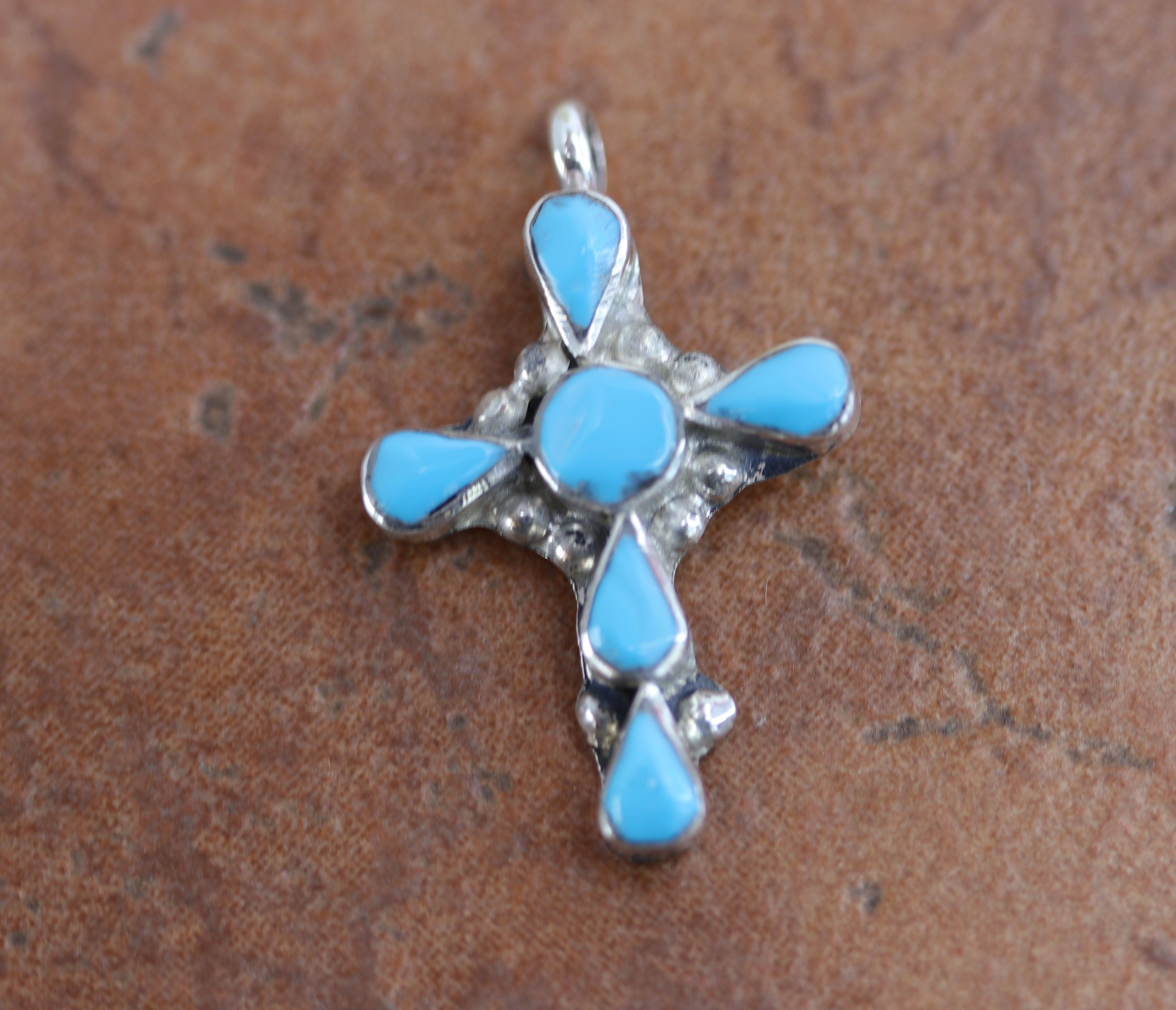 An authentic Zuni Native American Cross Pendant. It is made from Sterling Silver and turquoise. It is about 1 3/8" in length including the bail, and about 1/2" in width.