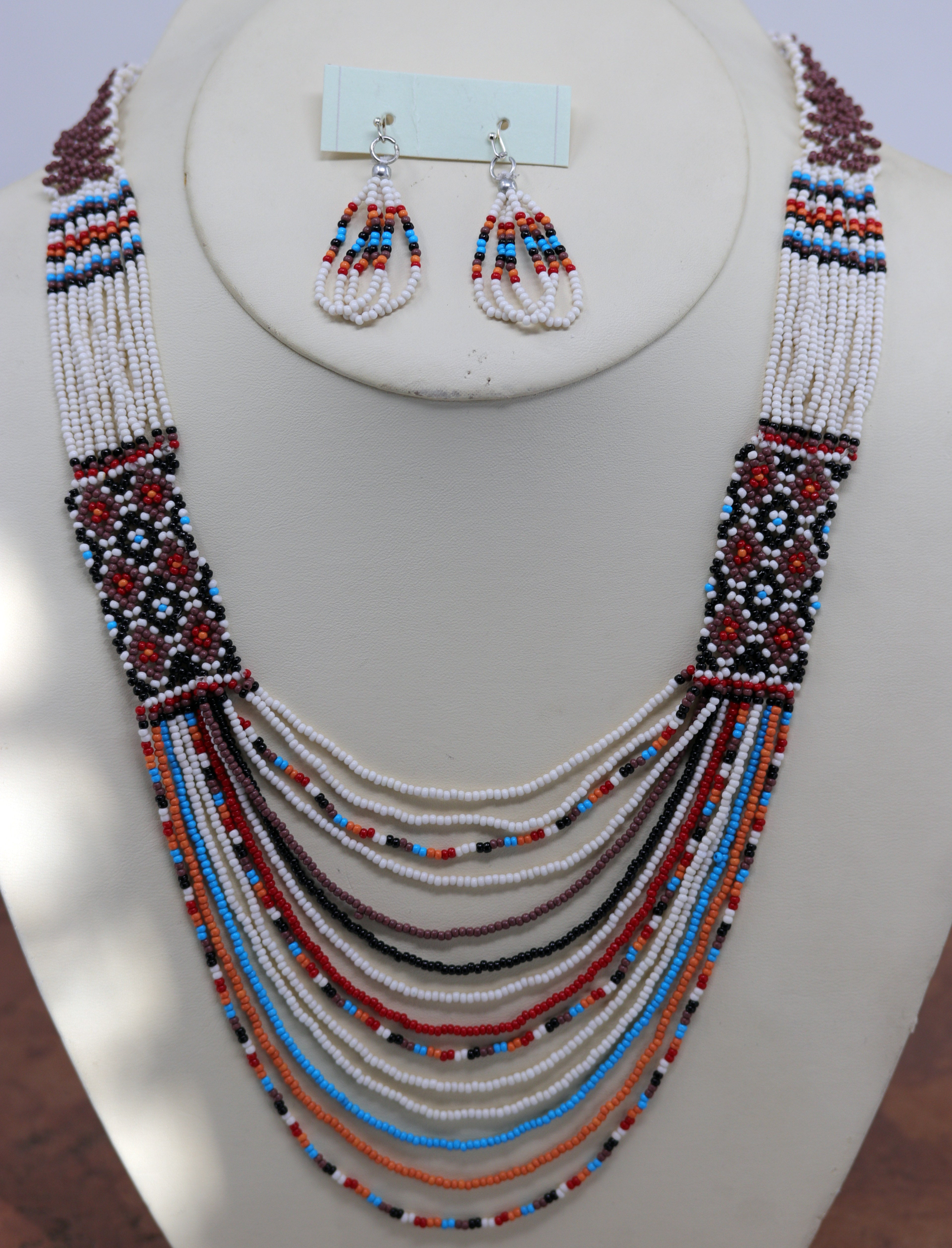 Beautiful necklace that is 23" in length plus a 3" extender. The width is 1". It is made from zinc alloy and beads. The earrings are 2" in length and 5/8" in width. This item is not Native American.