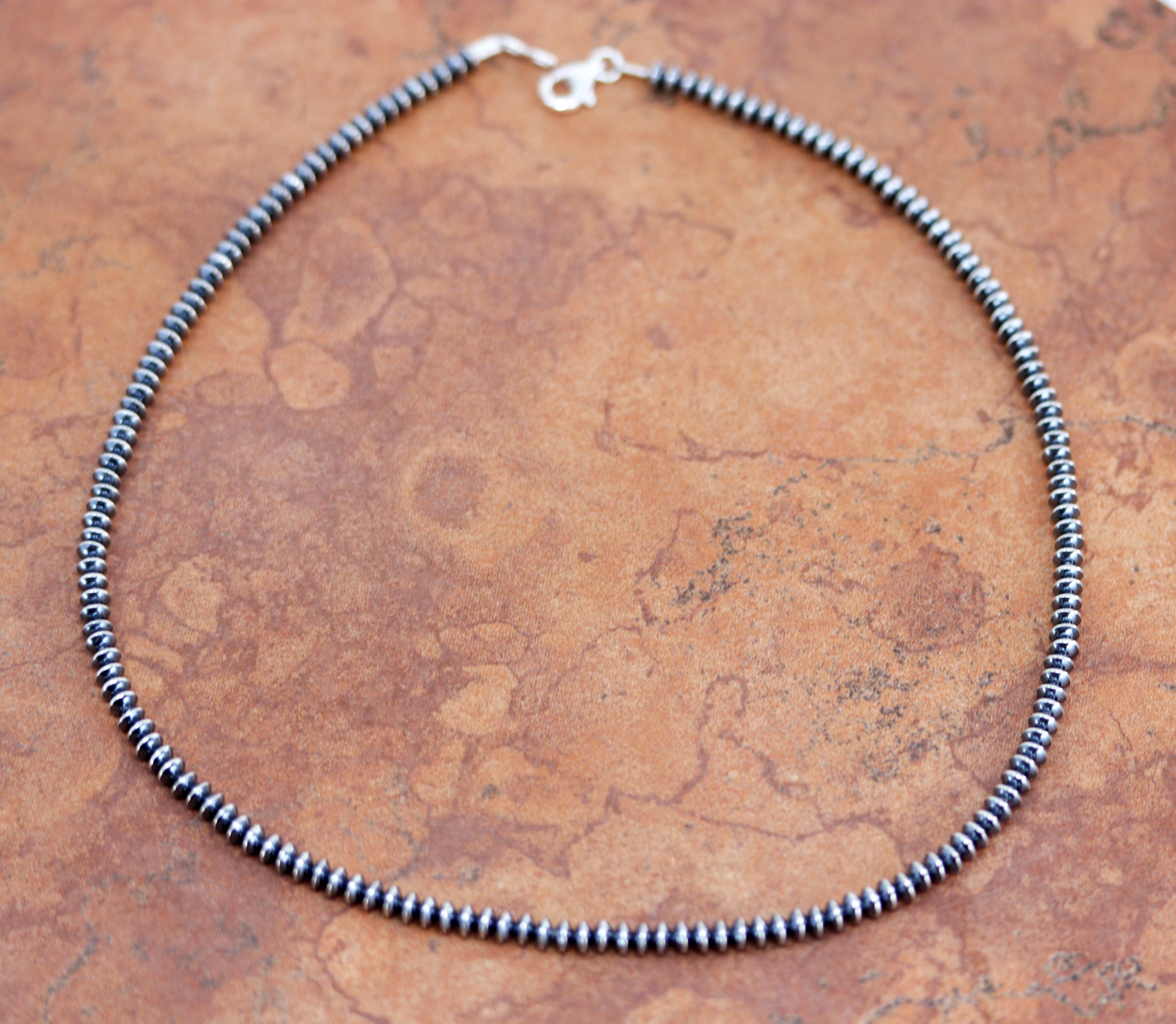 A beautiful silver Navajo Pearl necklace. The necklace is 20" in length and the beads measure 3 mm. This items is not Native American.