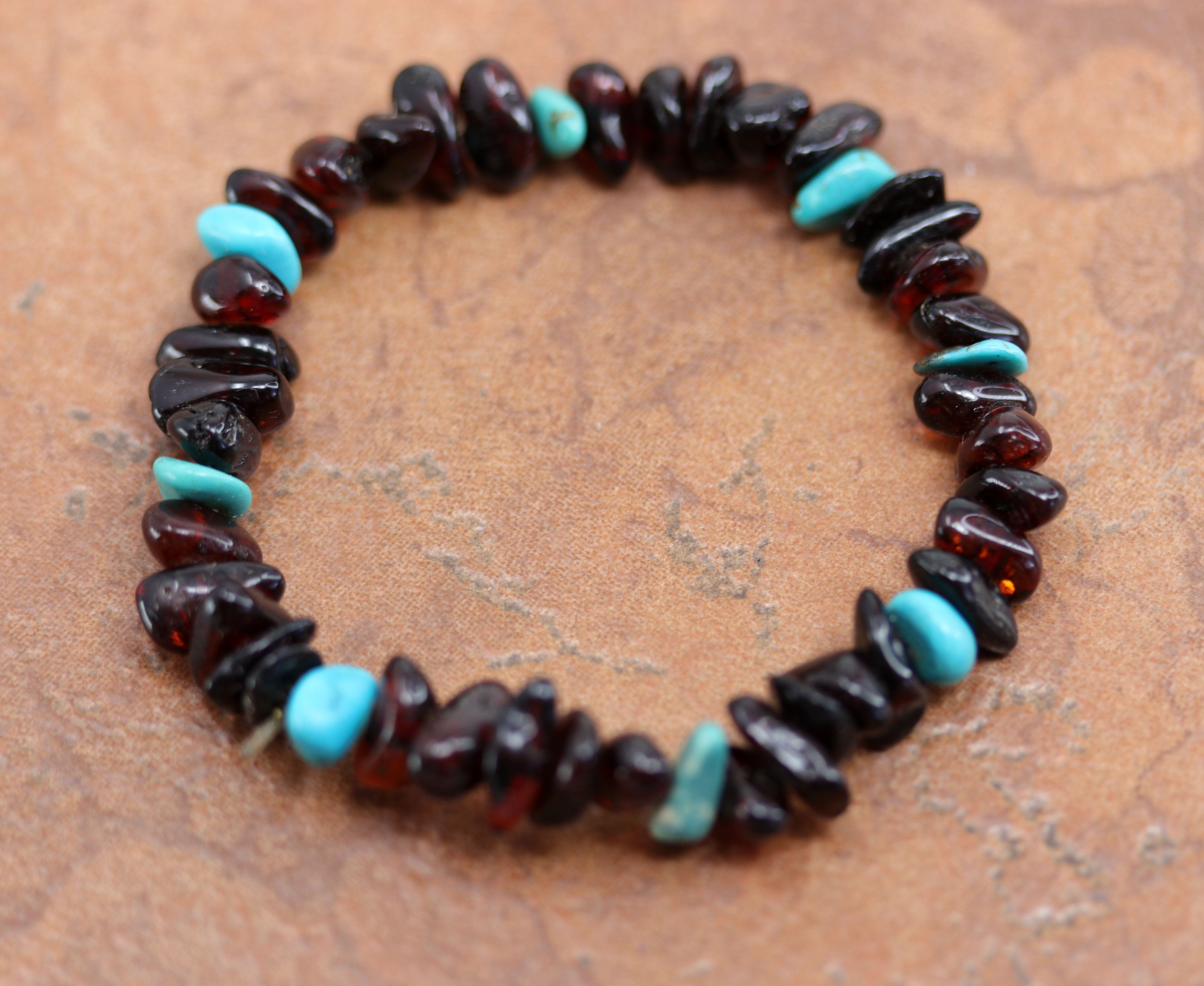 The amber comes from the Baltic Sea. It also has turquoise. It fits sizes 6" (more loose) to about 7" (tighter fit). The width is 1/2". This item is not Native American.
