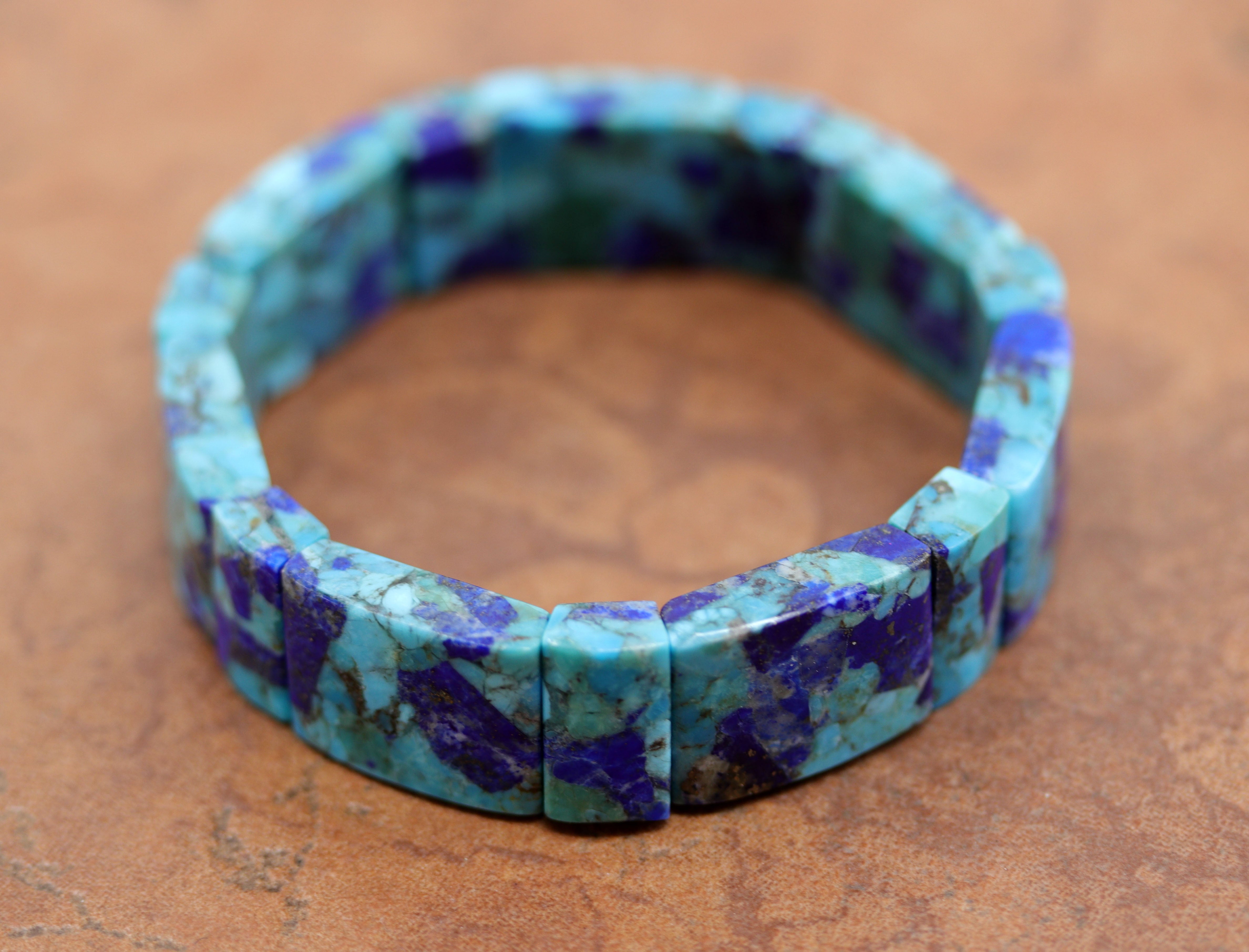 A beautiful bracelet made from stabilized turquoise lapis. It fits sizes 6" (more loose) to about 9" (tighter fit). The width of the bracelet is 7/8". This item is not Native American.