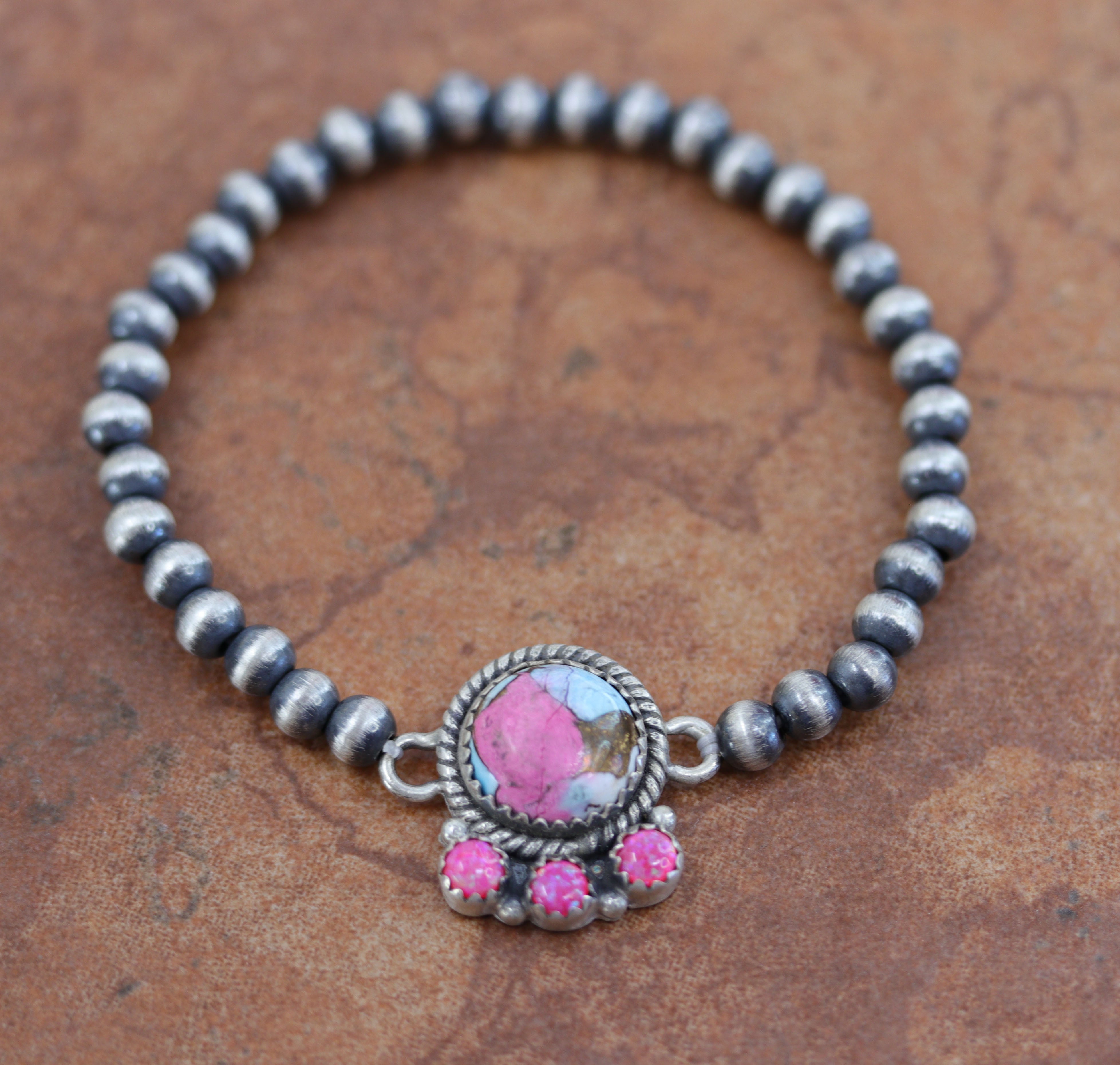 It is about 6" from end to end and the width of the Desert pearls are 4 mm at the widest point. It is made from sterling silver, cotton candy dahlia, and created opal. This item is not Native American.