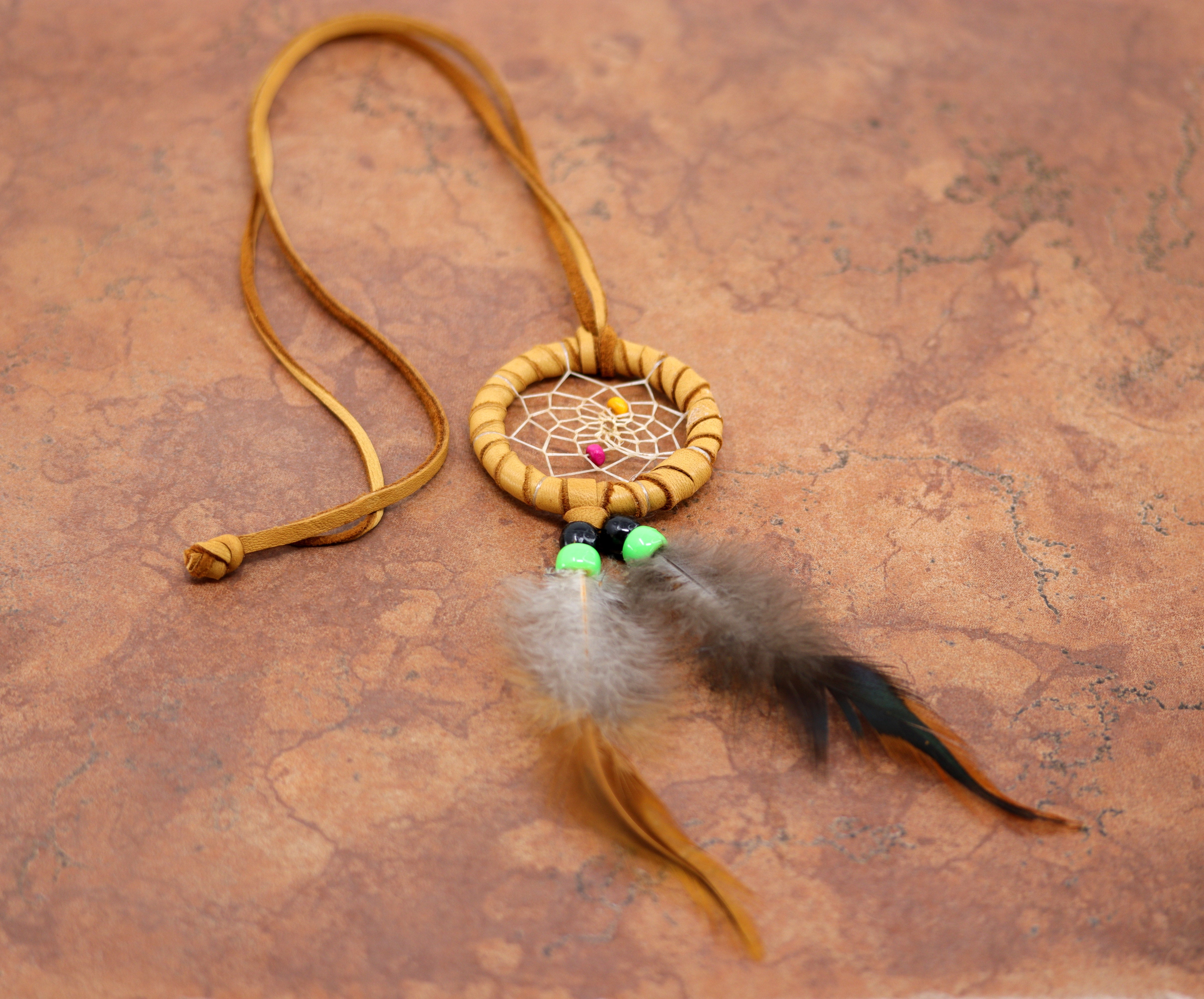 Navajo Native American leather dream catcher. The dream catcher is about 6" in length and 1 3/4" in width. The full length is 26".