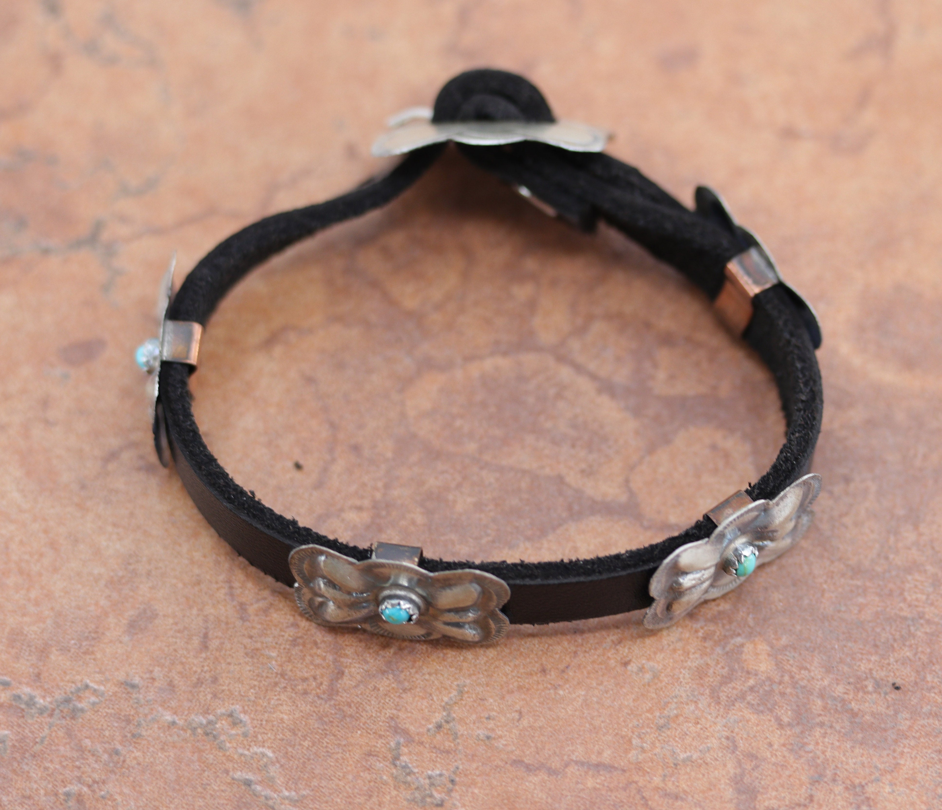 Unique Navajo Native American leather bracelet. It is made from leather, turquoise, and silver. It is about 9 3/4" in length and 1 1/8" wide. The butterflies are 5/8" wide. It is stamped Sterling.