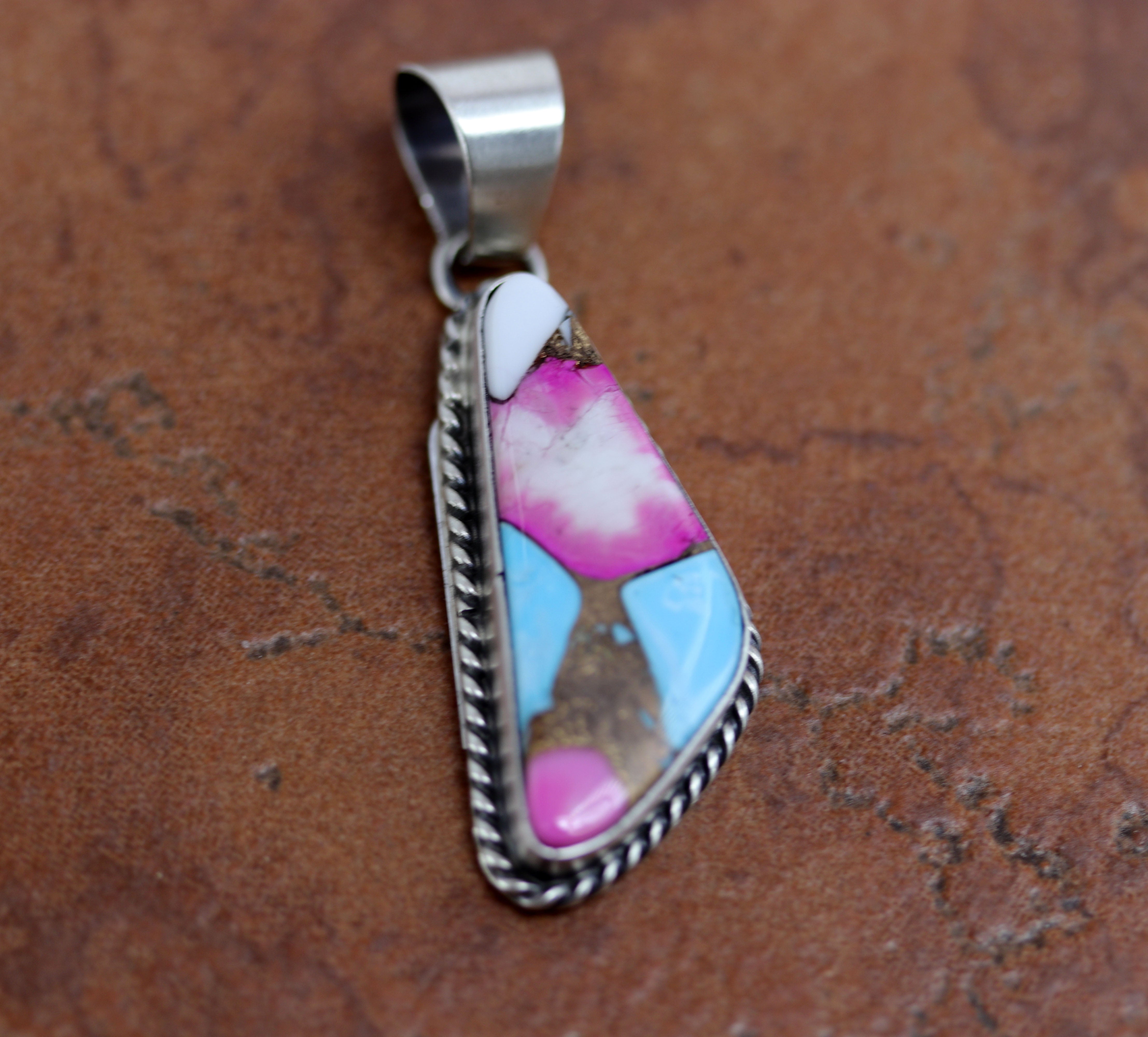 A beautiful Navajo Native American pendant by C Belone. It is made from sterling silver, and cotton candy dahlia turquoise. The pendant is about 2" in length and 3/4" in width.