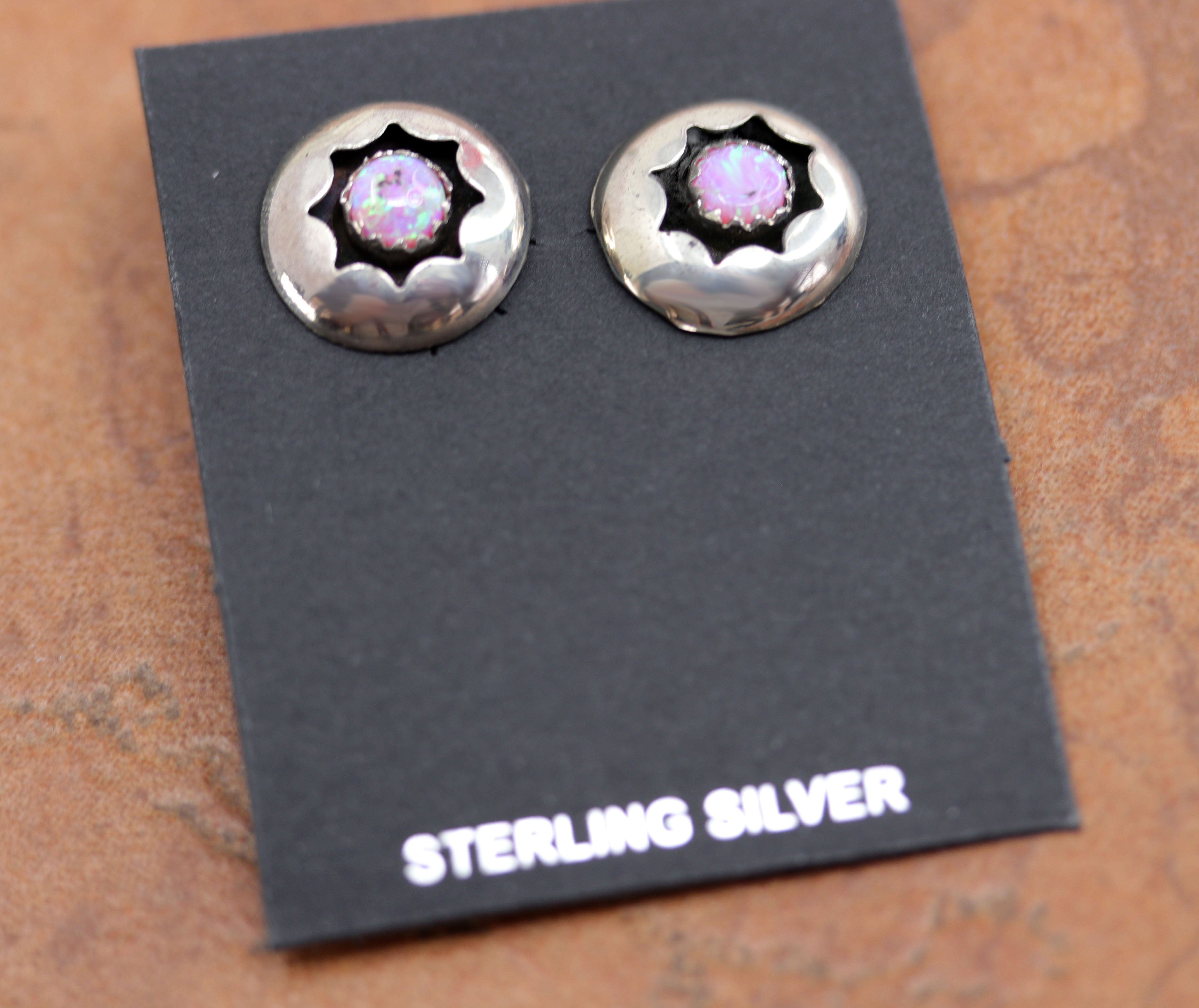 Lovely Navajo Native American Post Earrings. They are made from sterling silver and created opal. The earrings are about 5/8" in diameter.