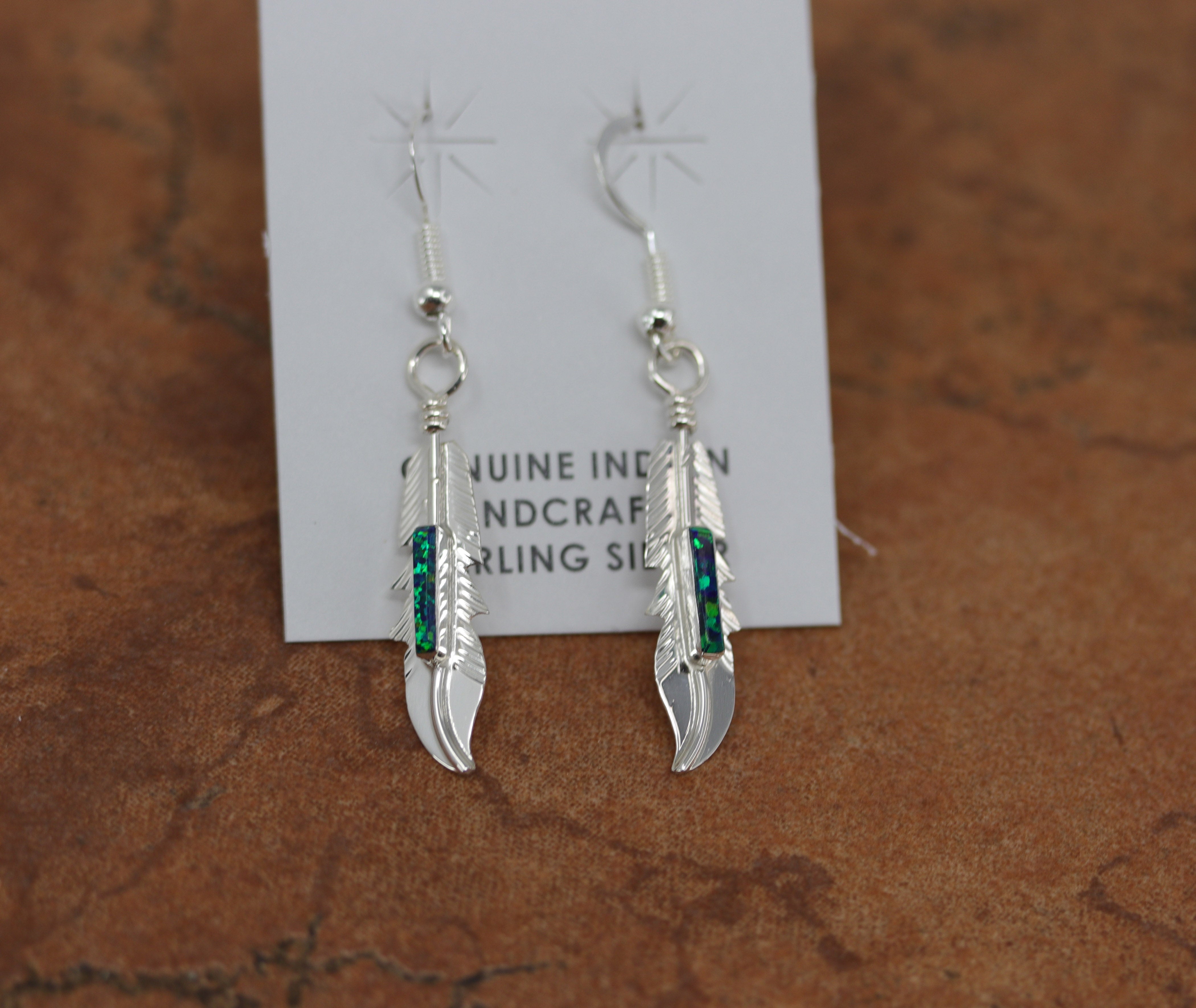 Beautiful Navajo Native American earrings. They are made from sterling silver and created opal. The earrings are about 2" in length including the hook and 3/8" wide.