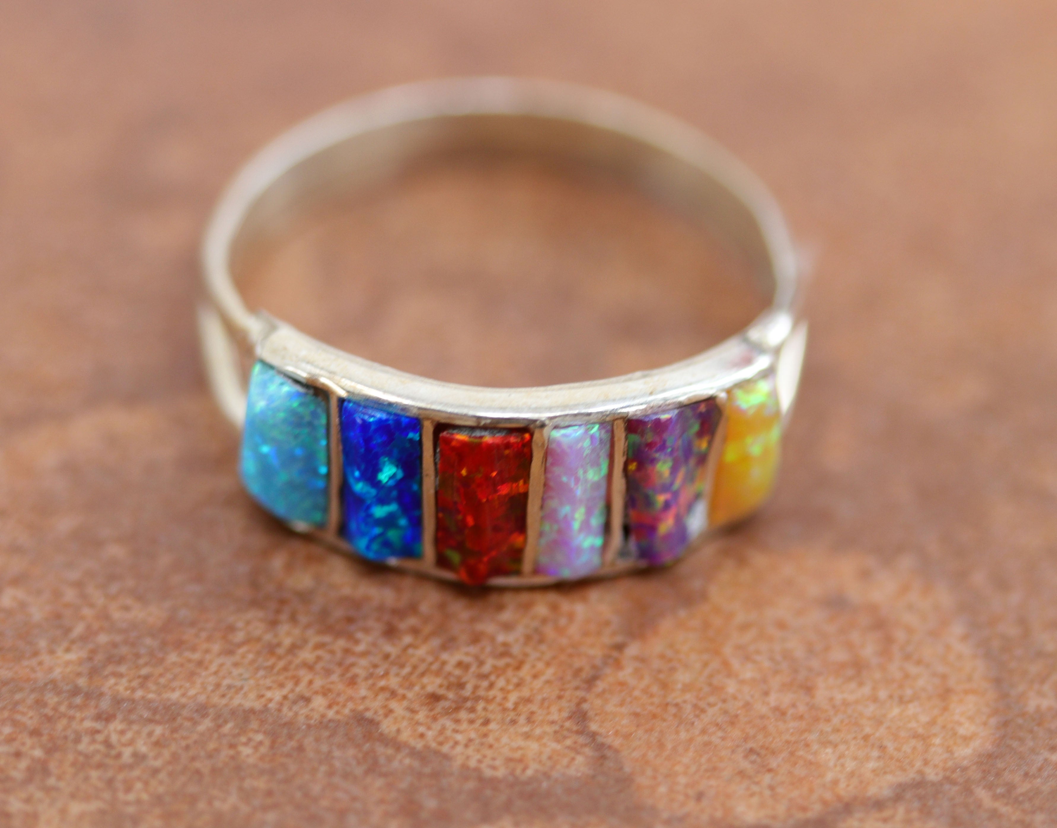 A lovely Navajo Native American ring. It is made from sterling silver and created opal. The ring size 8 1/2 and it is 5/16" in length.