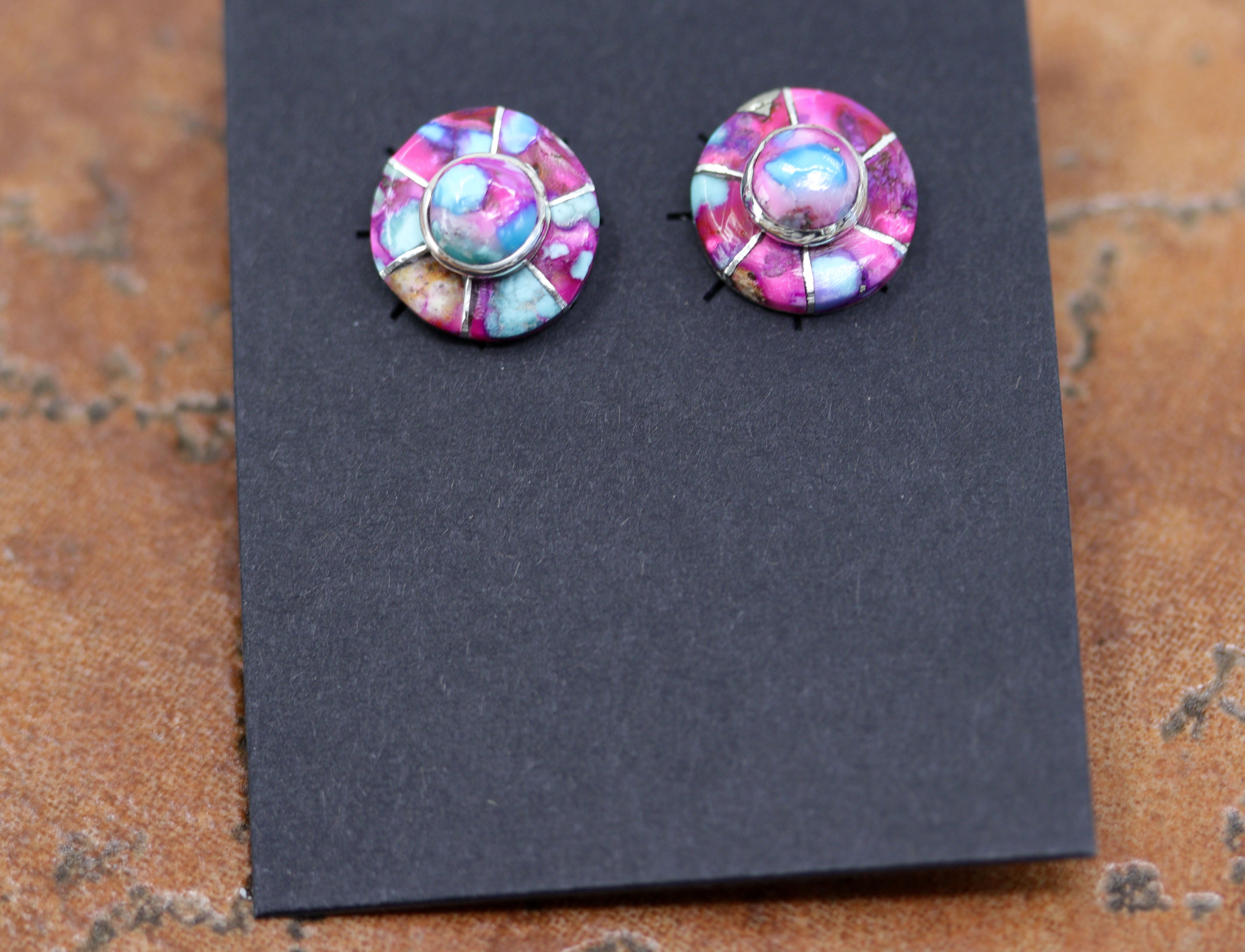 Beautiful Navajo Native American earrings. They are made from sterling silver and dahlia turquoise. The earrings are about 1/2" in diameter.