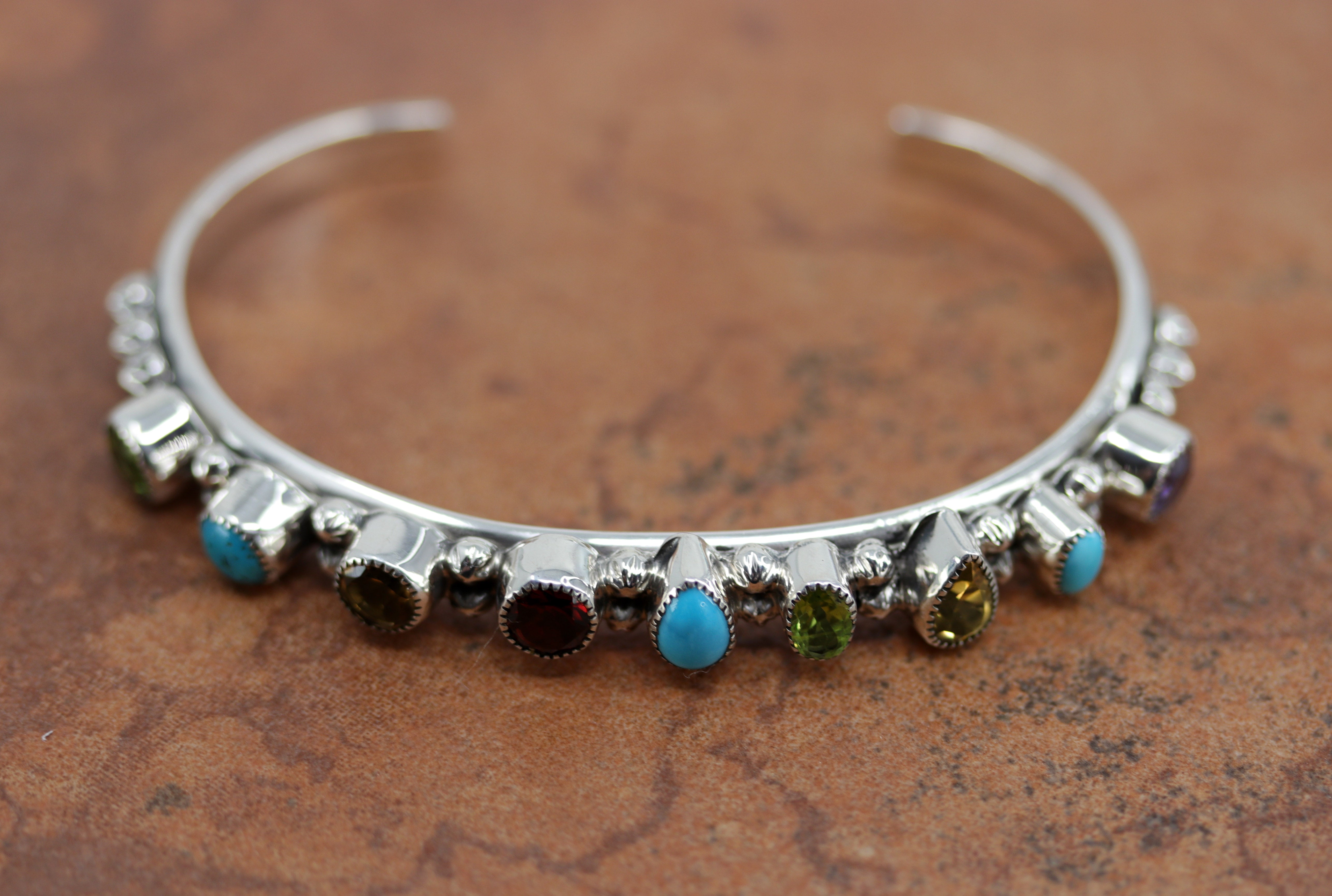 Navajo Native American bracelet by Sheena Jack. It is made from sterling silver and various gemstones. It is about 6" around and 1/4" wide. The opening is about 1 1/2", and it is partly flexible.