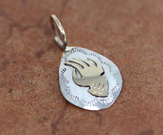 An authentic Native American pendant. It is made from sterling silver and gold overlay. The pendant is 1 3/8" in length (including the bail) and 3/4" at the widest point.