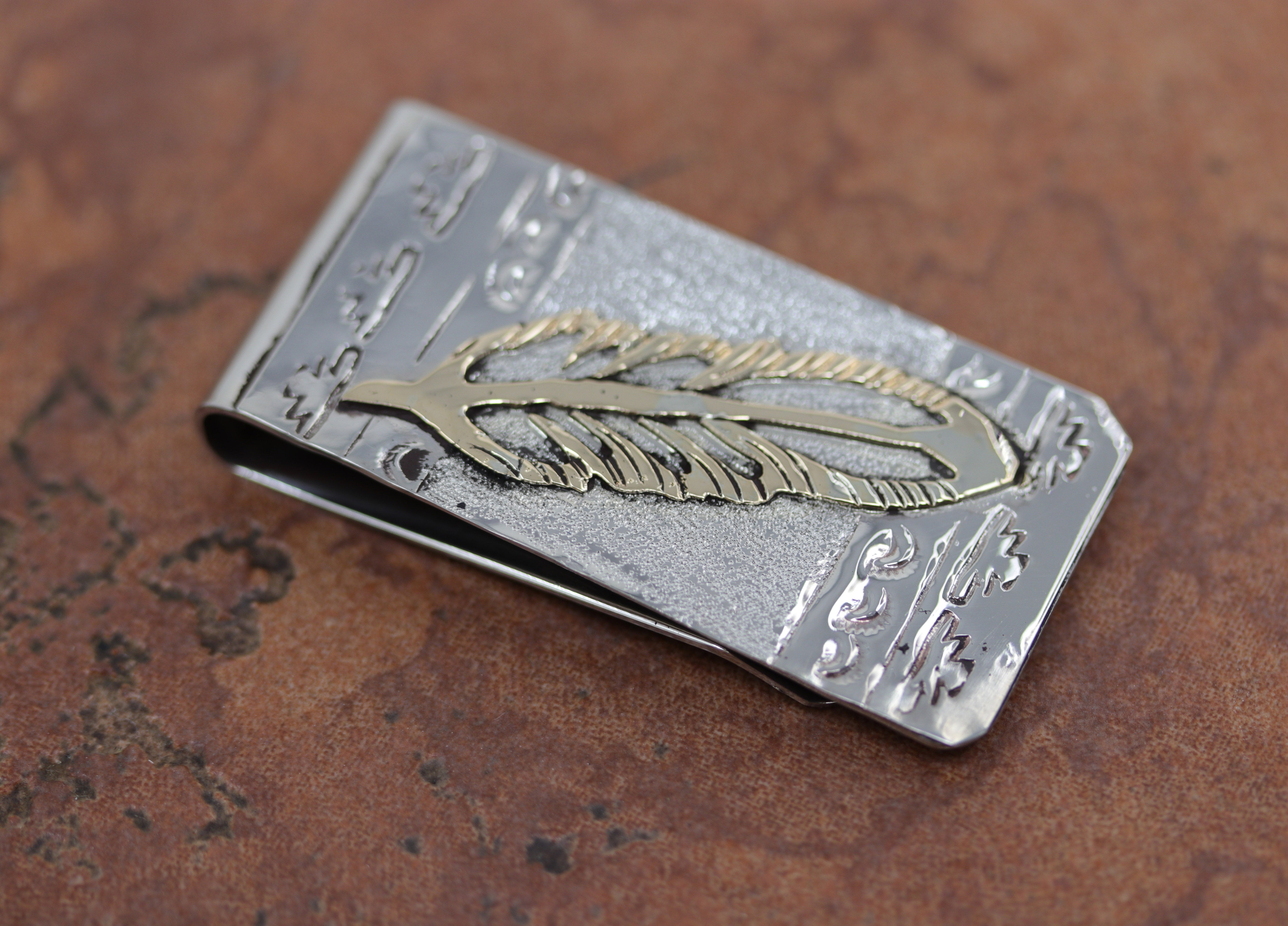 Lovely Navajo Native American money clip. It is made from sterling silver, and gold overlay. The lower part of the money clip is made from nickel to give it more durability. It is about 1 3/4" in length and 1" wide.