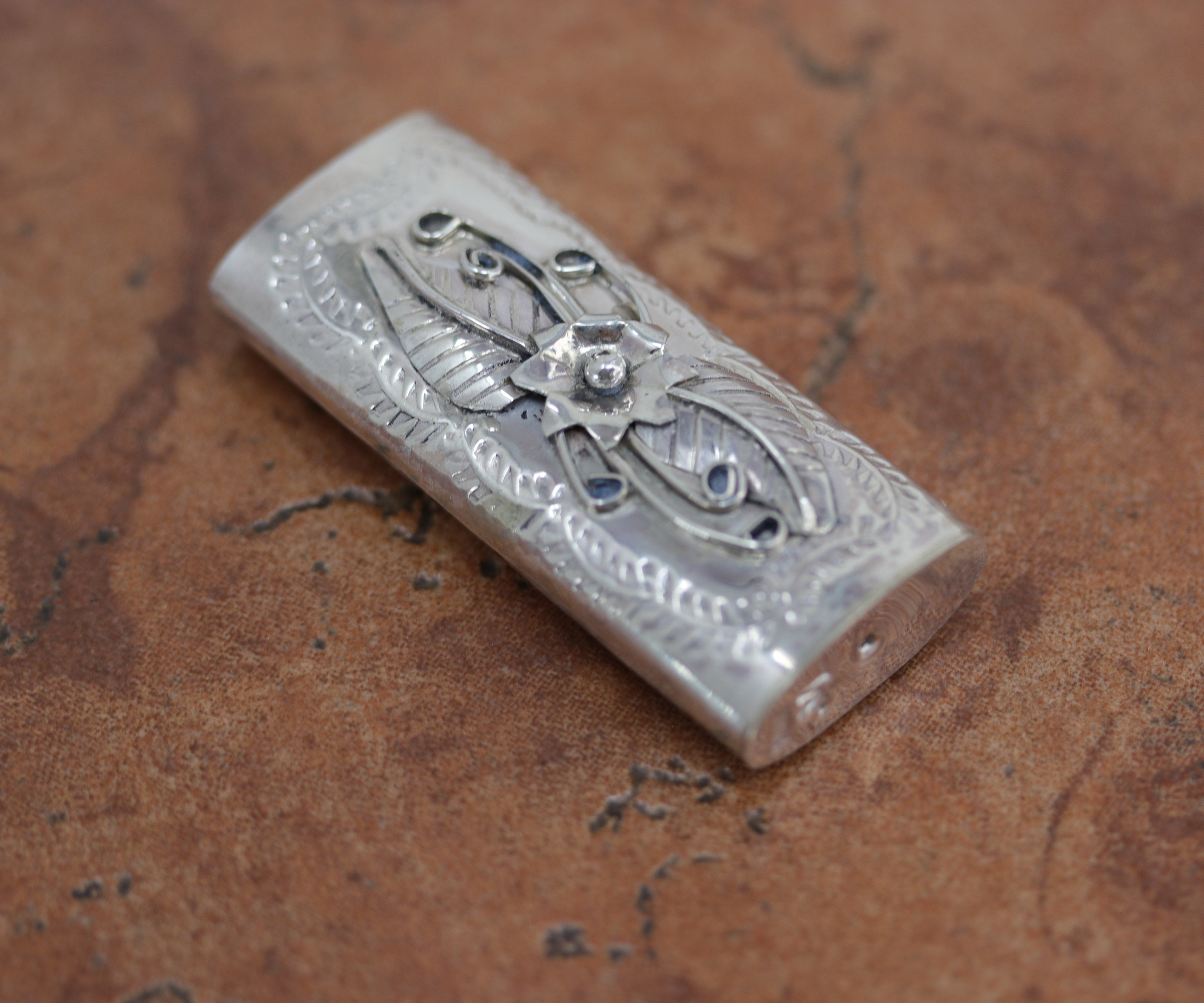A lighter case made from sterling silver. It measures 2 1/8" by 1".