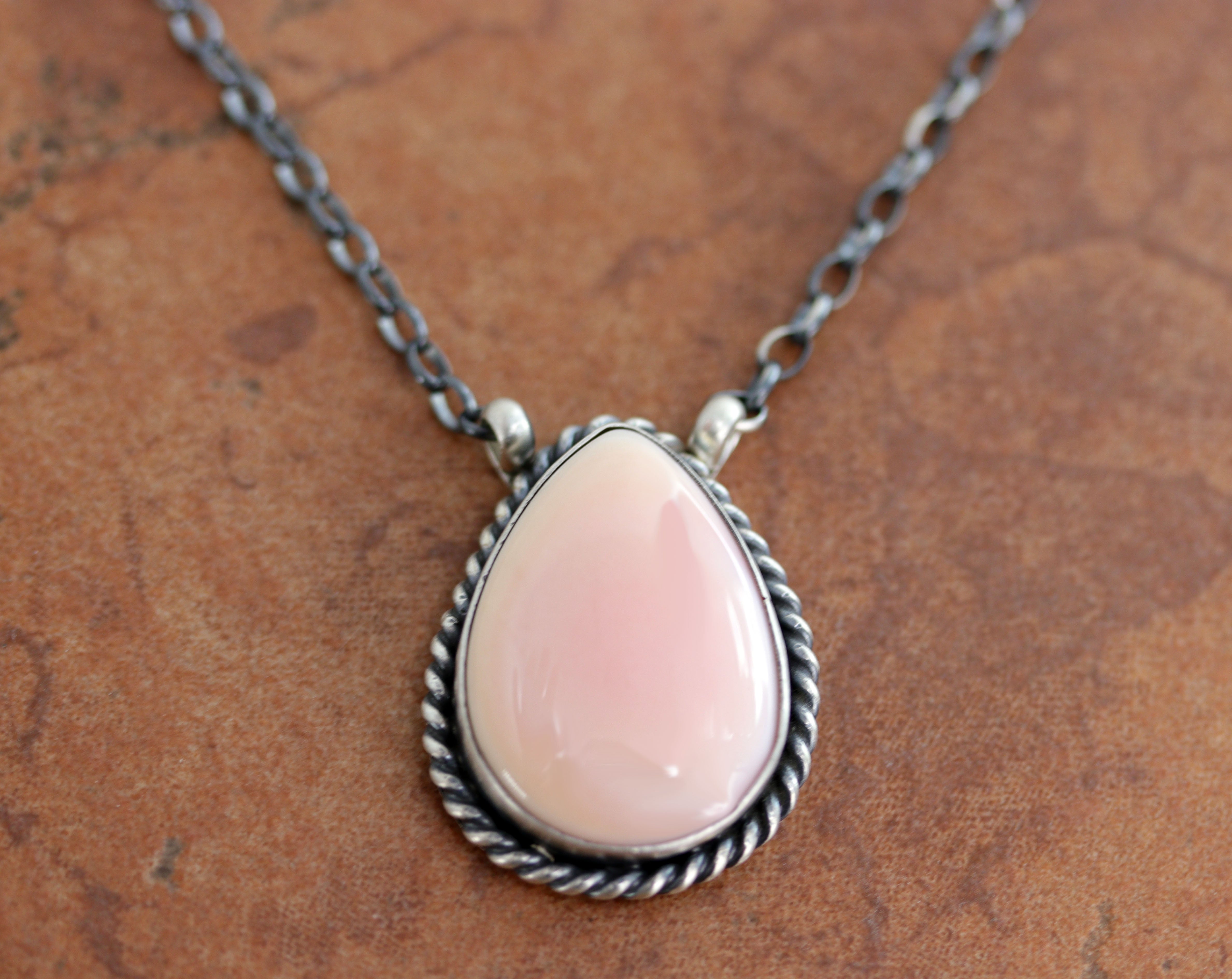 A beautiful necklace made by Eugene Balone. It is made from sterling silver and pink quartz. The necklace is about 16 1/2" in length. The center measures 7/8" in width.