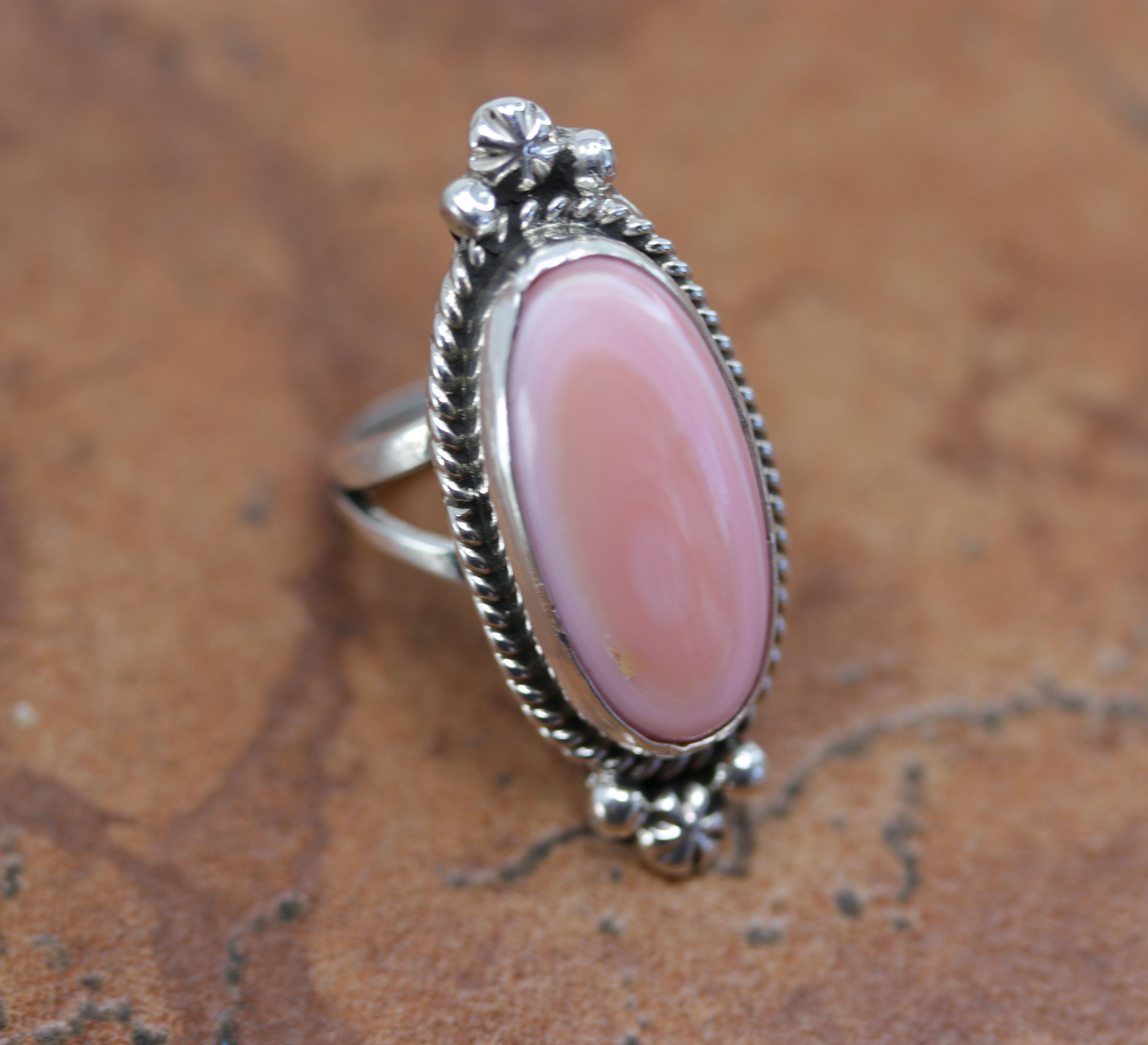 A lovely Navajo Native American ring. It is made from sterling silver and pink quartz. The ring size 7 and it is 1" 1/8 in length.