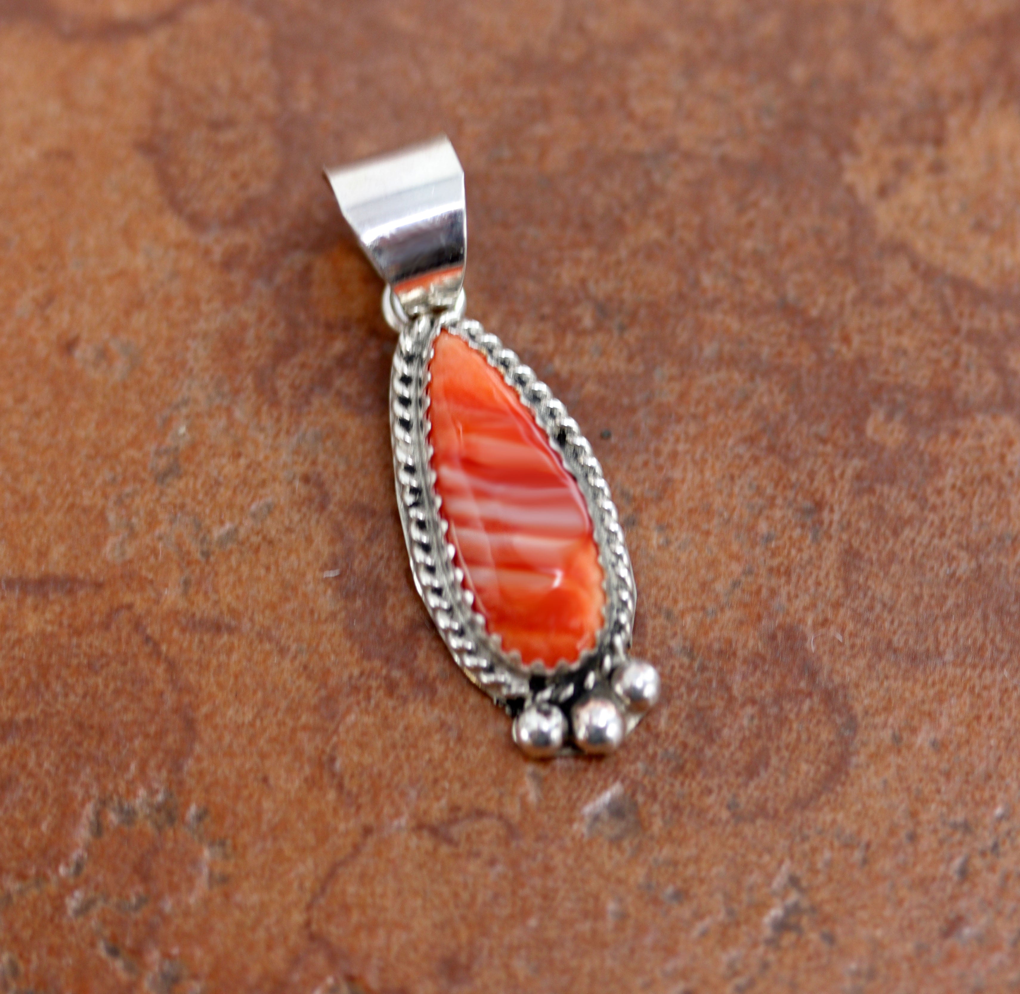Lovely Navajo Native American Pendant by Begay. It is made from sterling silver and spiny oyster. It is 1 1/2" long and about 7/16" wide.