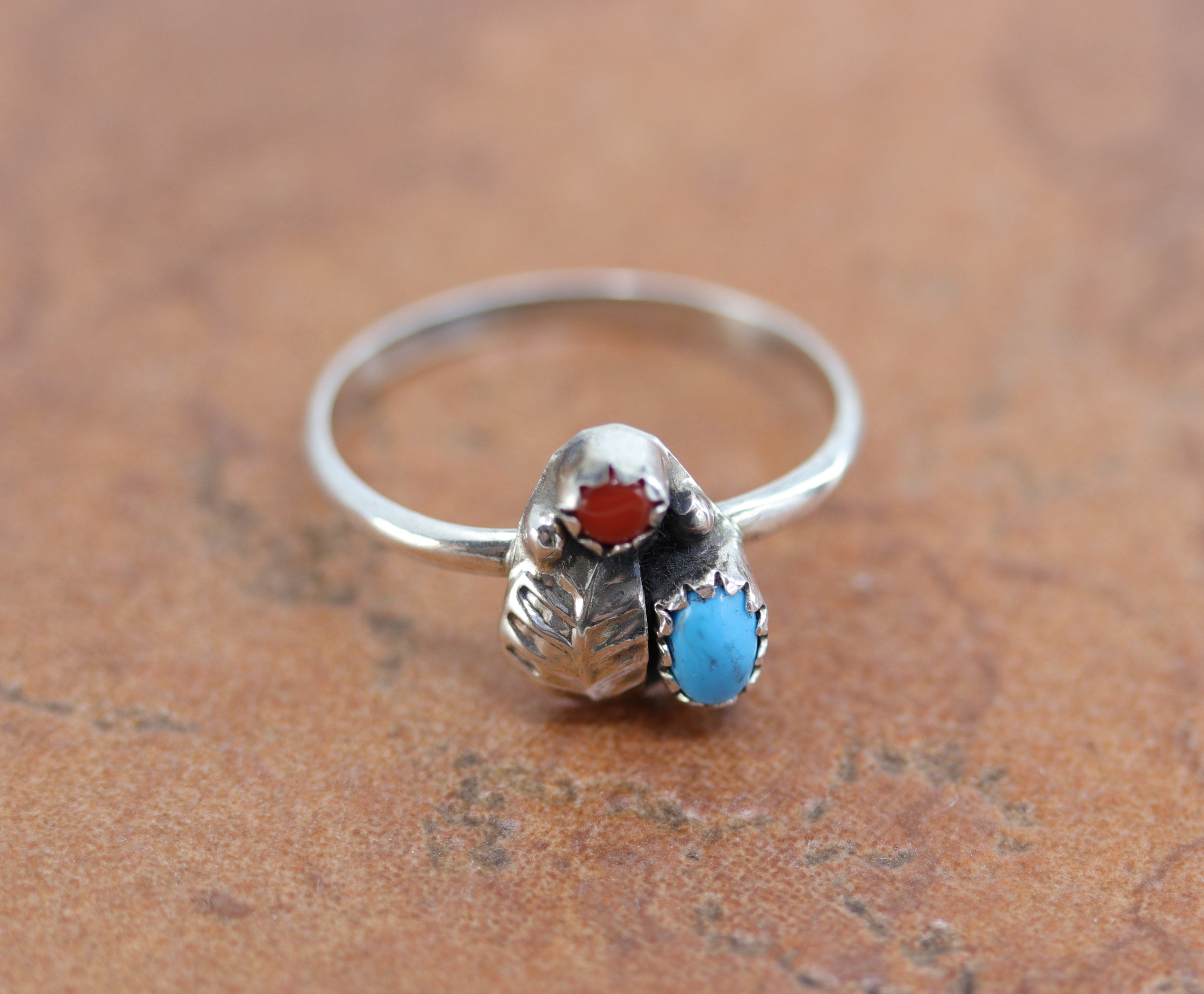A beautiful Navajo Native American ring. It is made from sterling silver, coral, and turquoise. The ring size 6 and it is 1/2" in length.