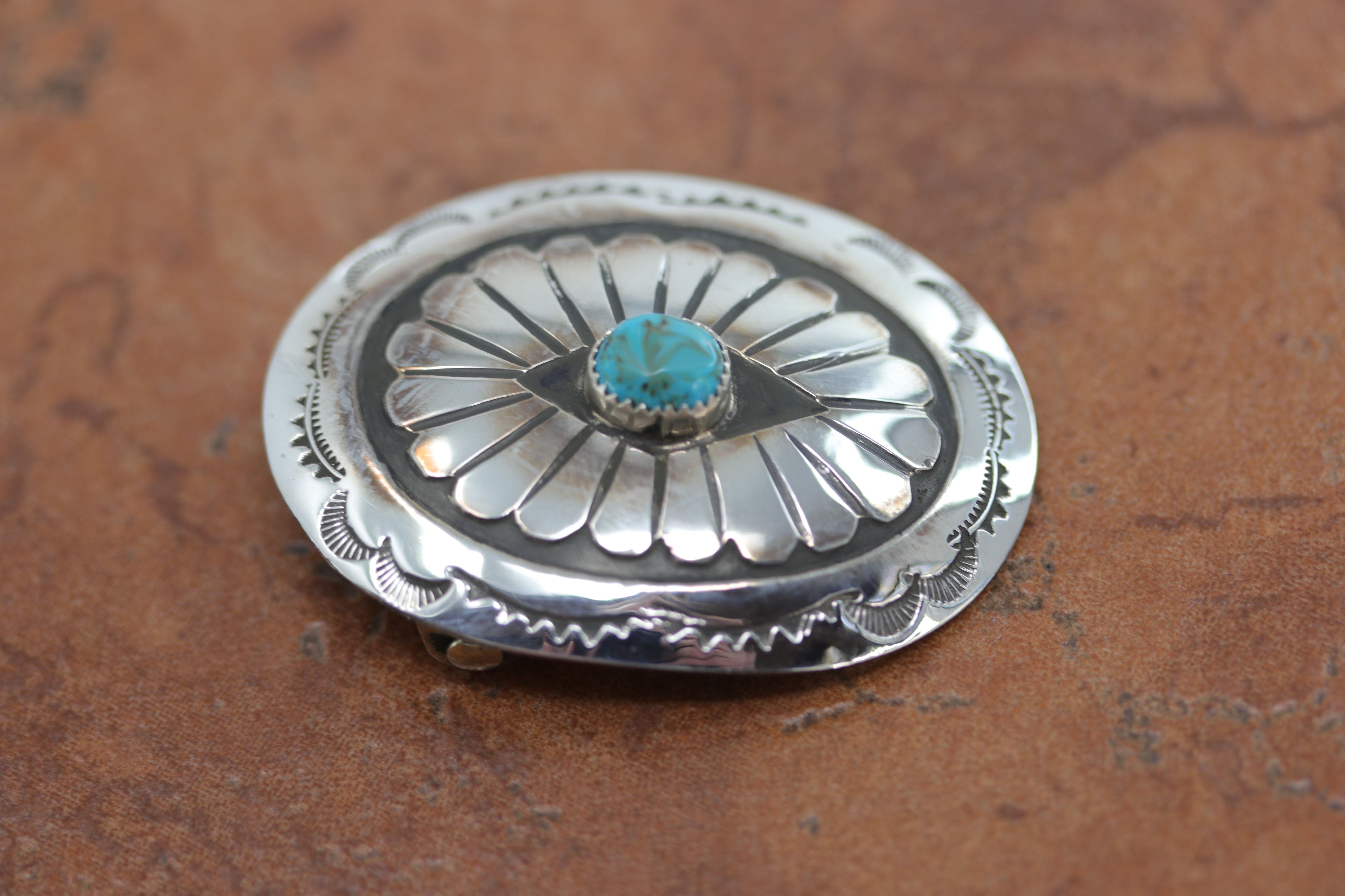 Authentic Navajo Native American Belt Buckle. It is made from sterling silver and turquoise. It is about 2" by 1 5/8". It will hold a belt up to 7/8" wide.