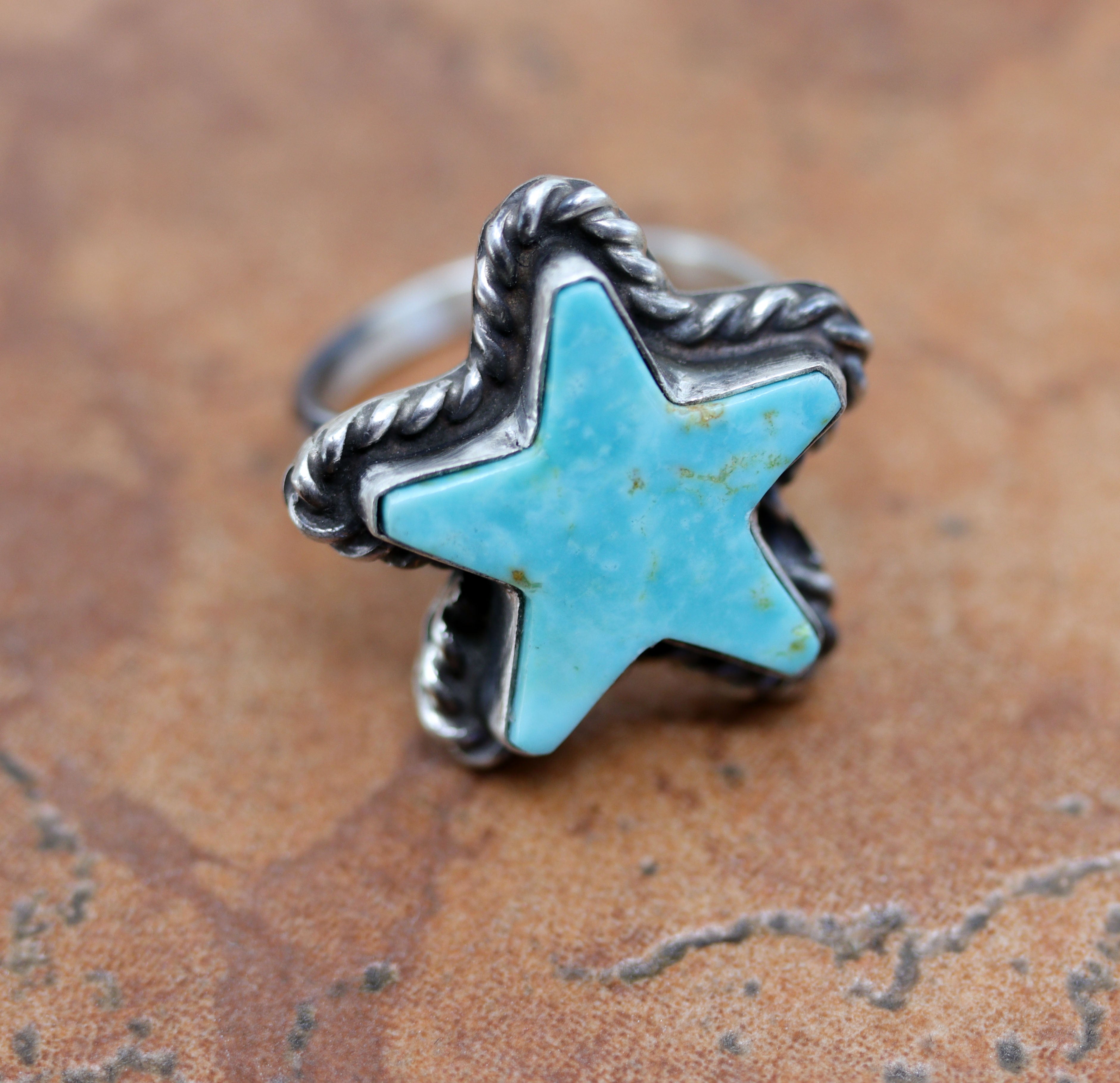 A beautiful Navajo Native American ring. It is made from sterling silver and turquoise. The ring size is adjustable and fits sizes 6 to 8 and it is 1 1/8" in length.