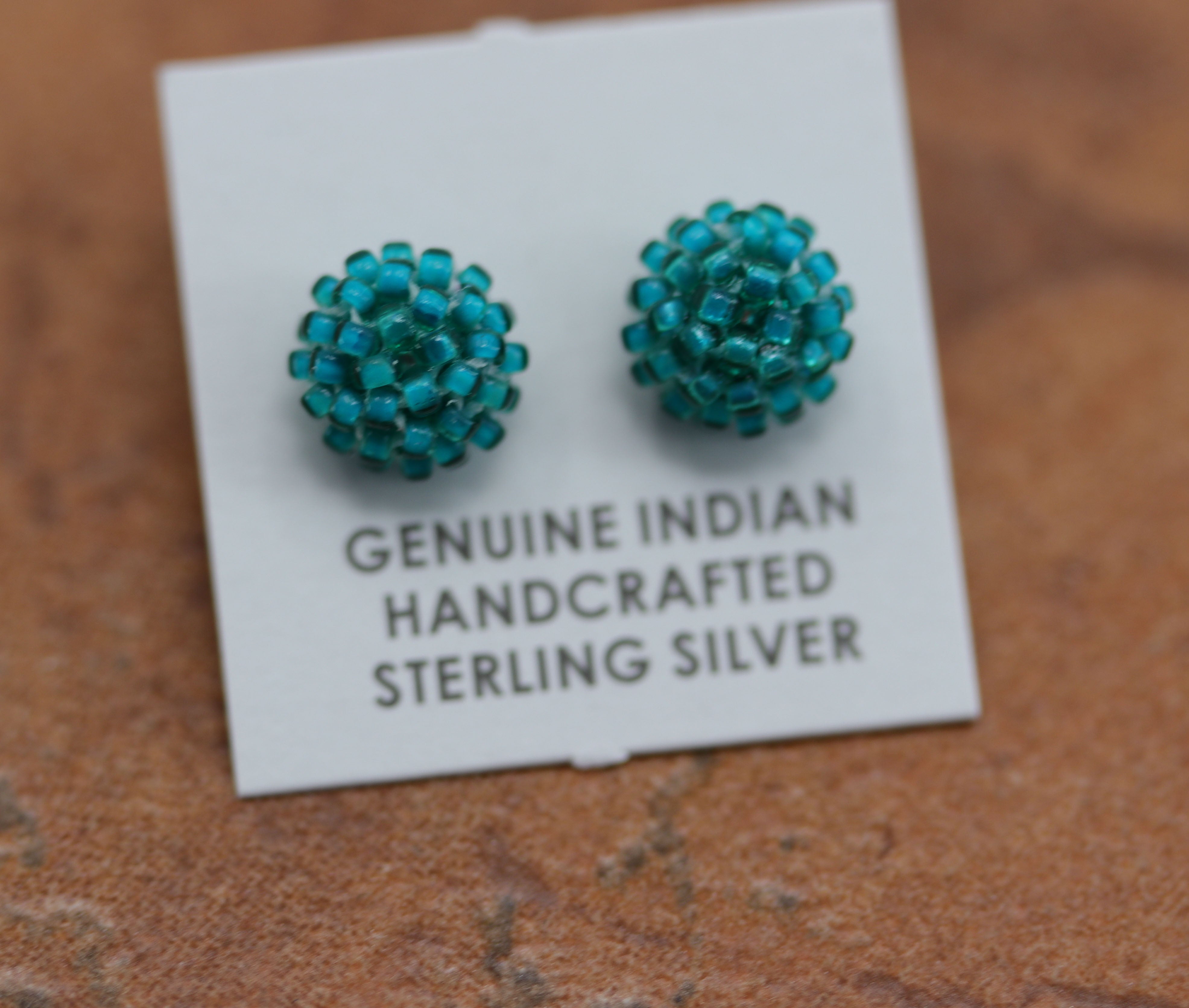 Navajo Native American earrings. They are made from sterling silver and blue beads. The earrings about 3/8" in diameter.