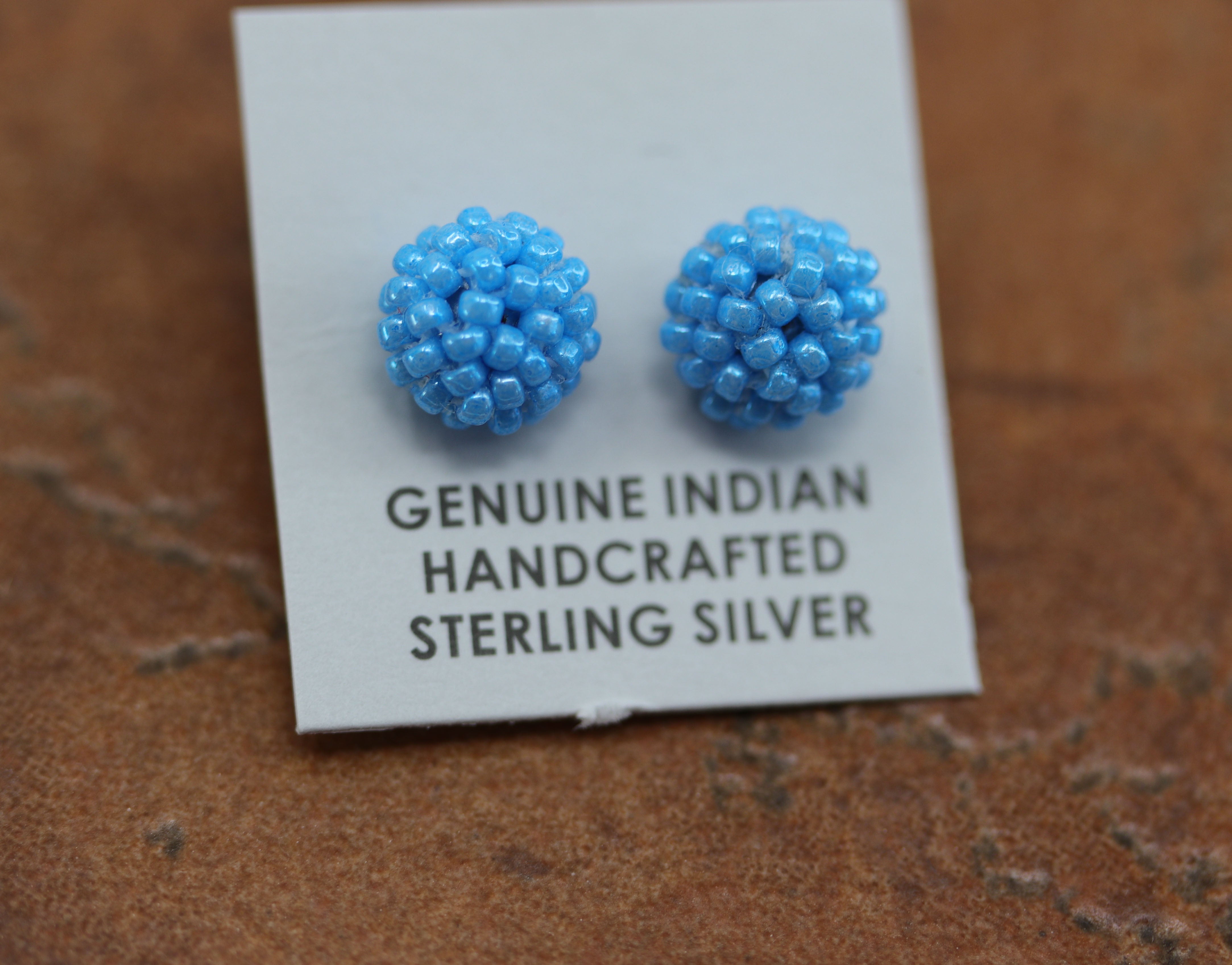 Navajo Native American earrings. They are made from sterling silver and blue beads. The earrings about 3/8" in diameter.