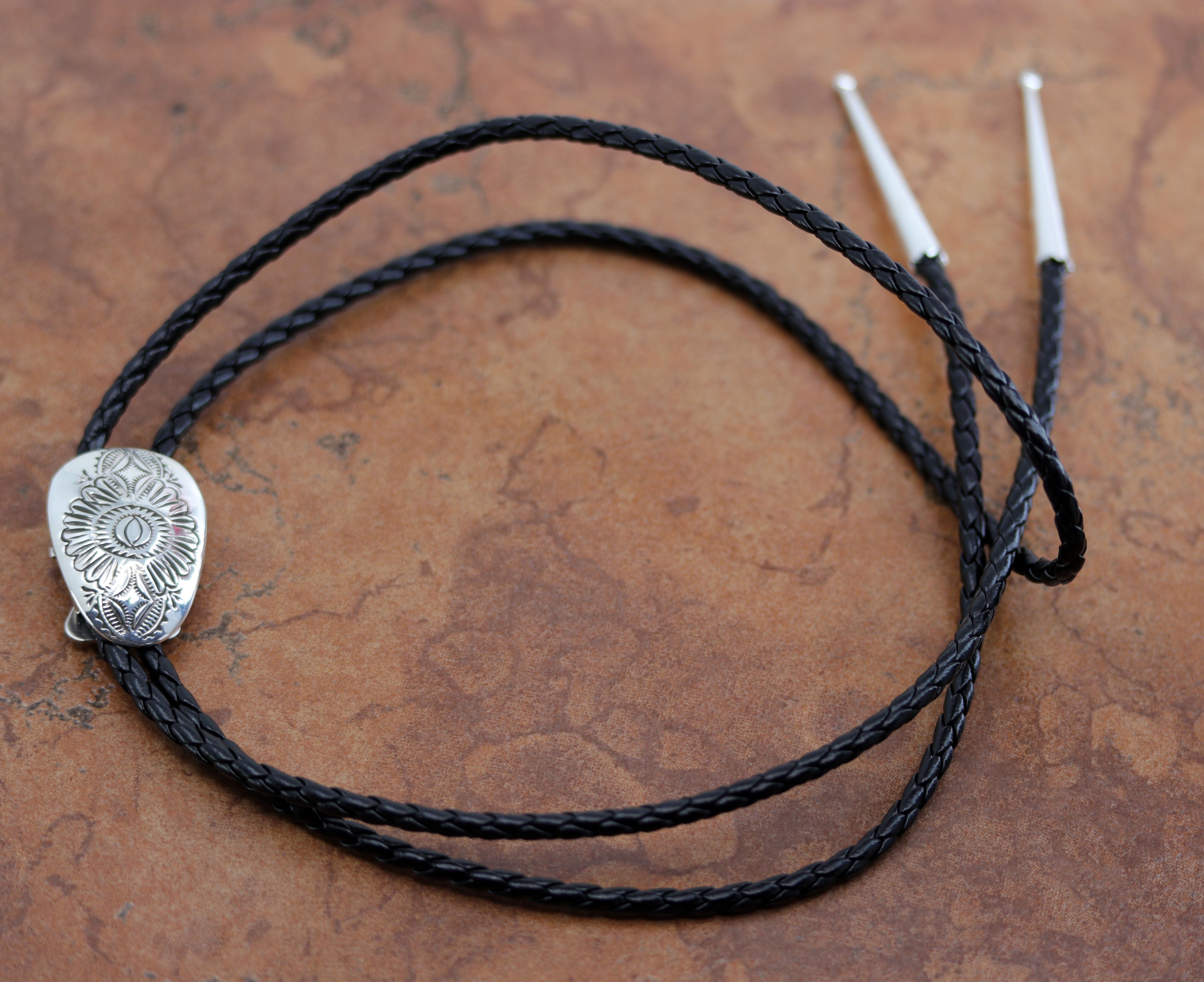 An authentic Navajo Native American Bolo Tie. The bolo tie is made of sterling silver. The cord measures about 44". The bolo measures 1 3/8" by 1".
