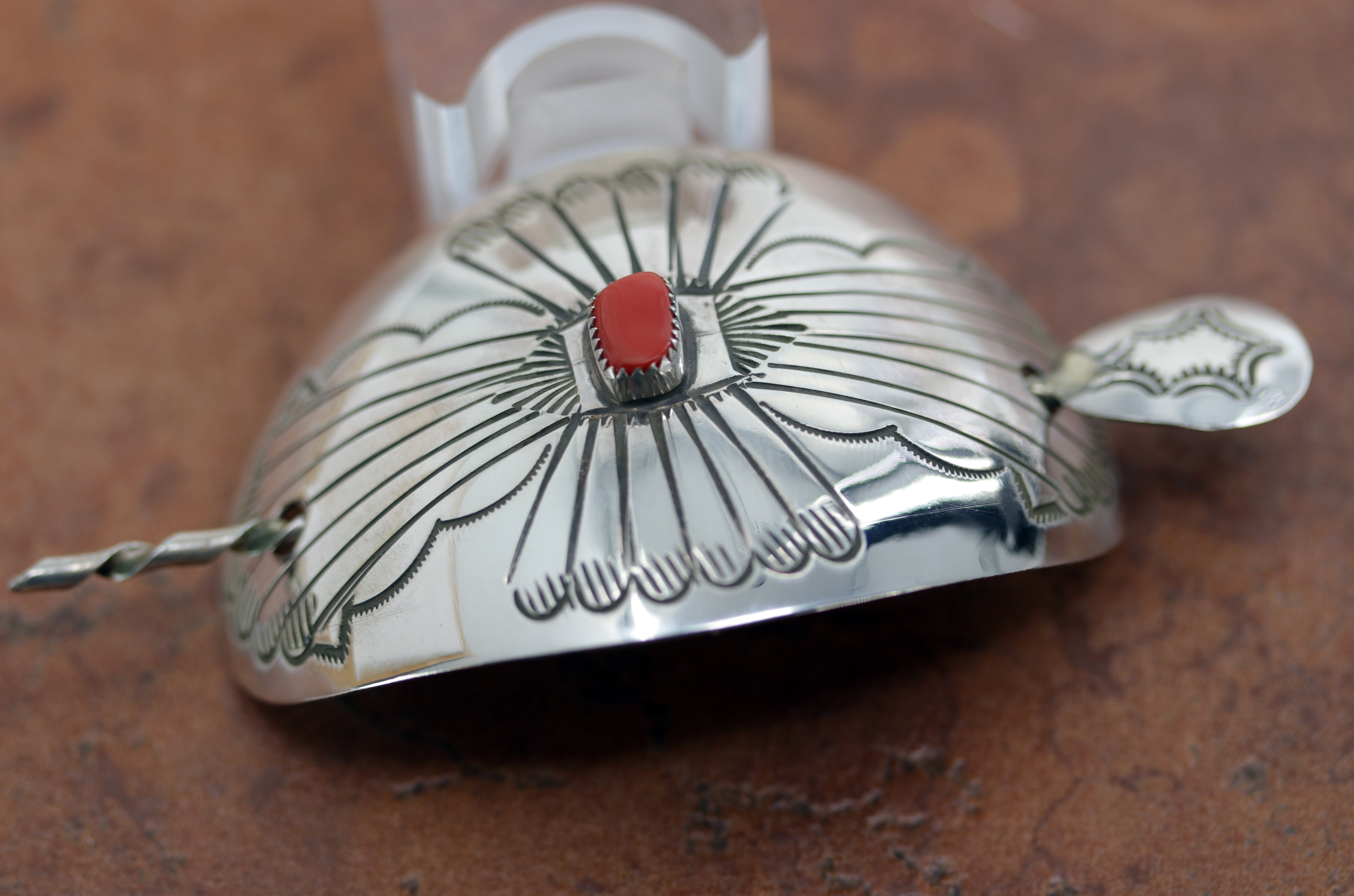 Lovely Navajo Native American Barrette made from sterling silver and coral. It is 1 3/4" long, and about 2 3/4" wide. The pin measures 3 3/4" in length.