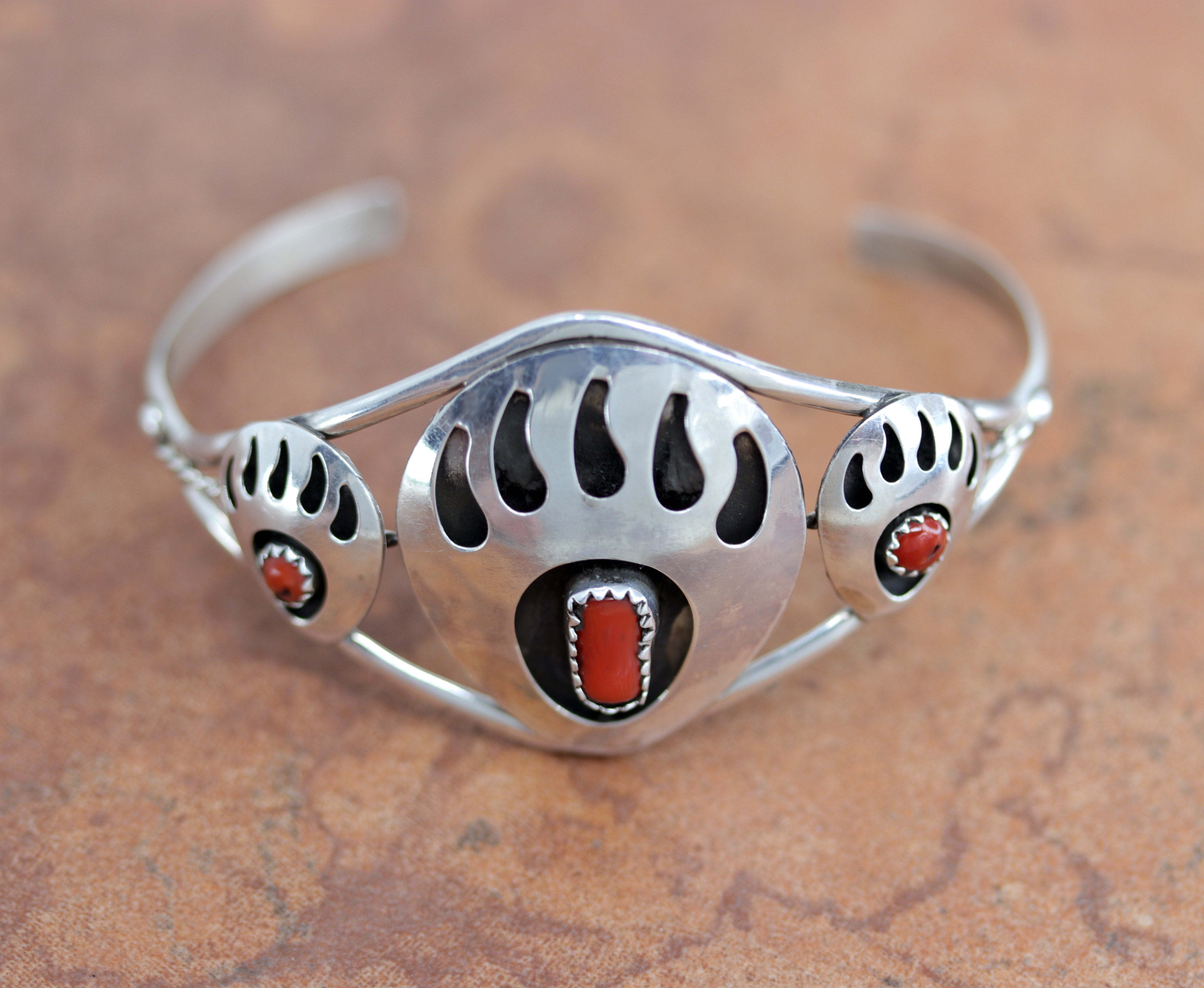 Navajo Sterling Silver Coral Bear Paw Bracelet