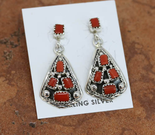 Beautiful Navajo Native American earrings. They are made from sterling silver and coral. The earrings are about 1 5/8" in length and 7/8" wide.