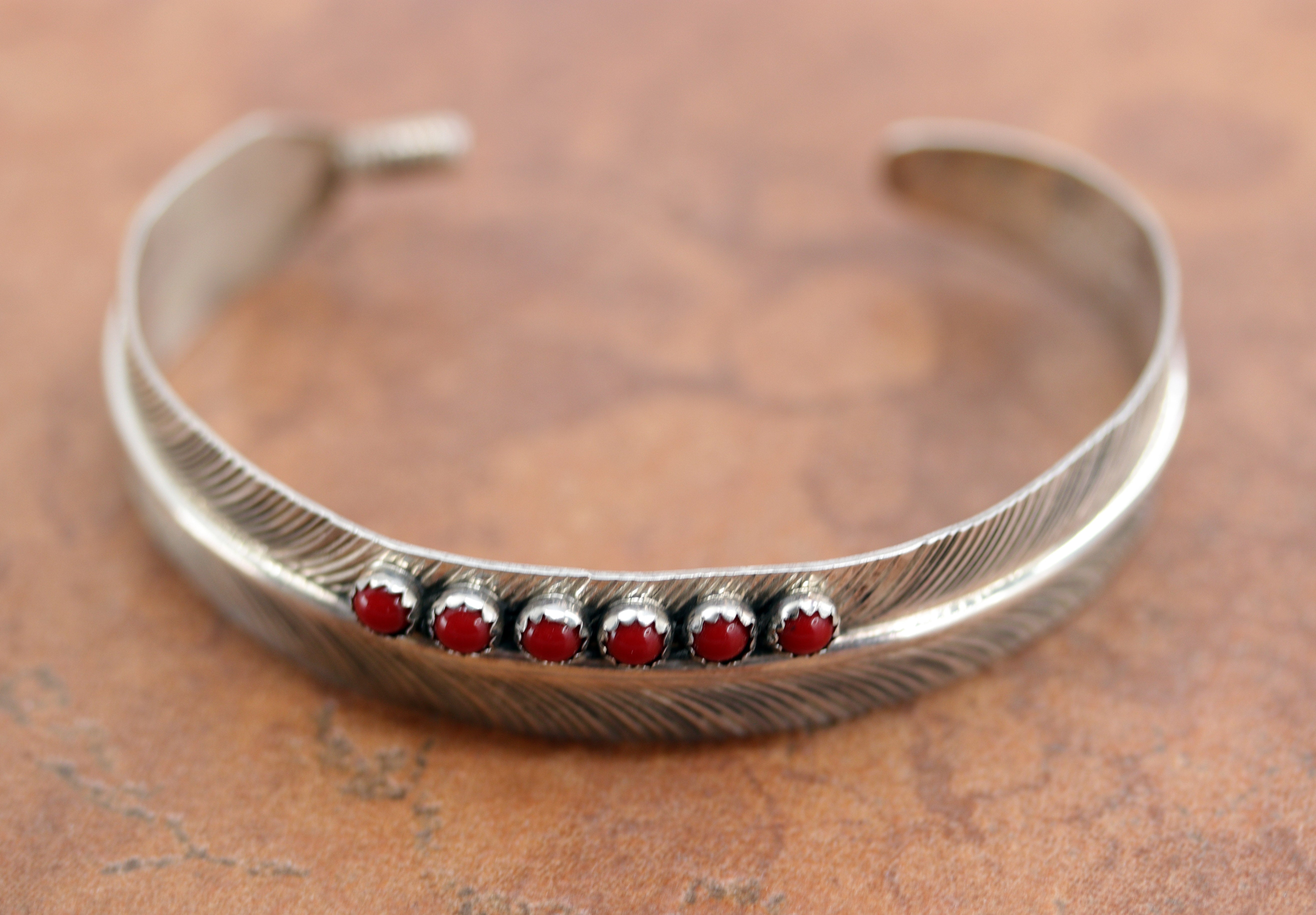 Navajo Sterling Silver Coral Feather Cuff Bracelet