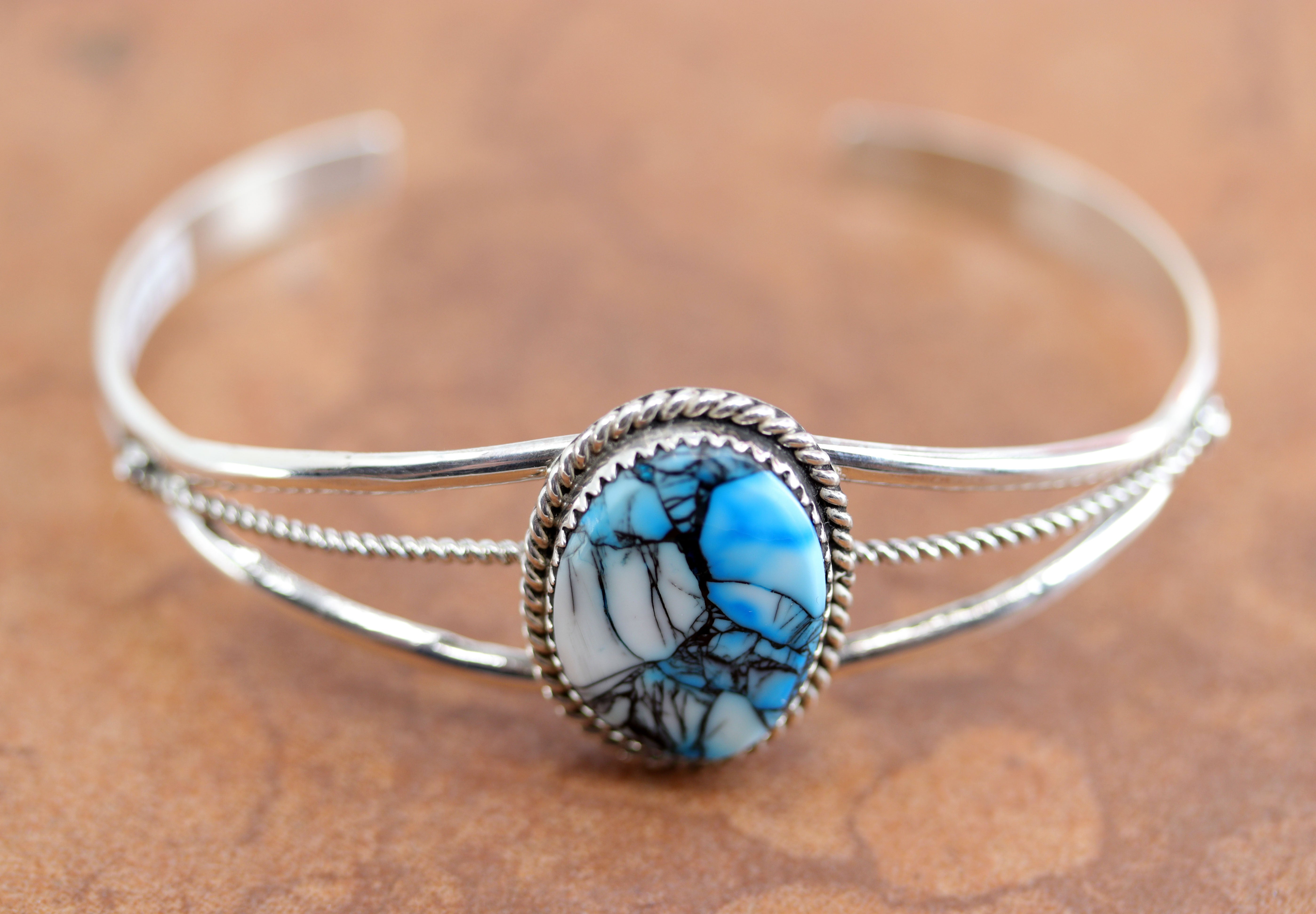 A beautiful Navajo Native American bracelet. It is made from sterling silver and dahlia turquoise. It is about 6" around and 1" wide. The opening is about 1", and partly flexible. It is stamped sterling.