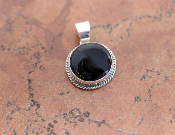 It is made from sterling silver and onyx. The pendant is about 1 1/4" in length and 7/8" in width.