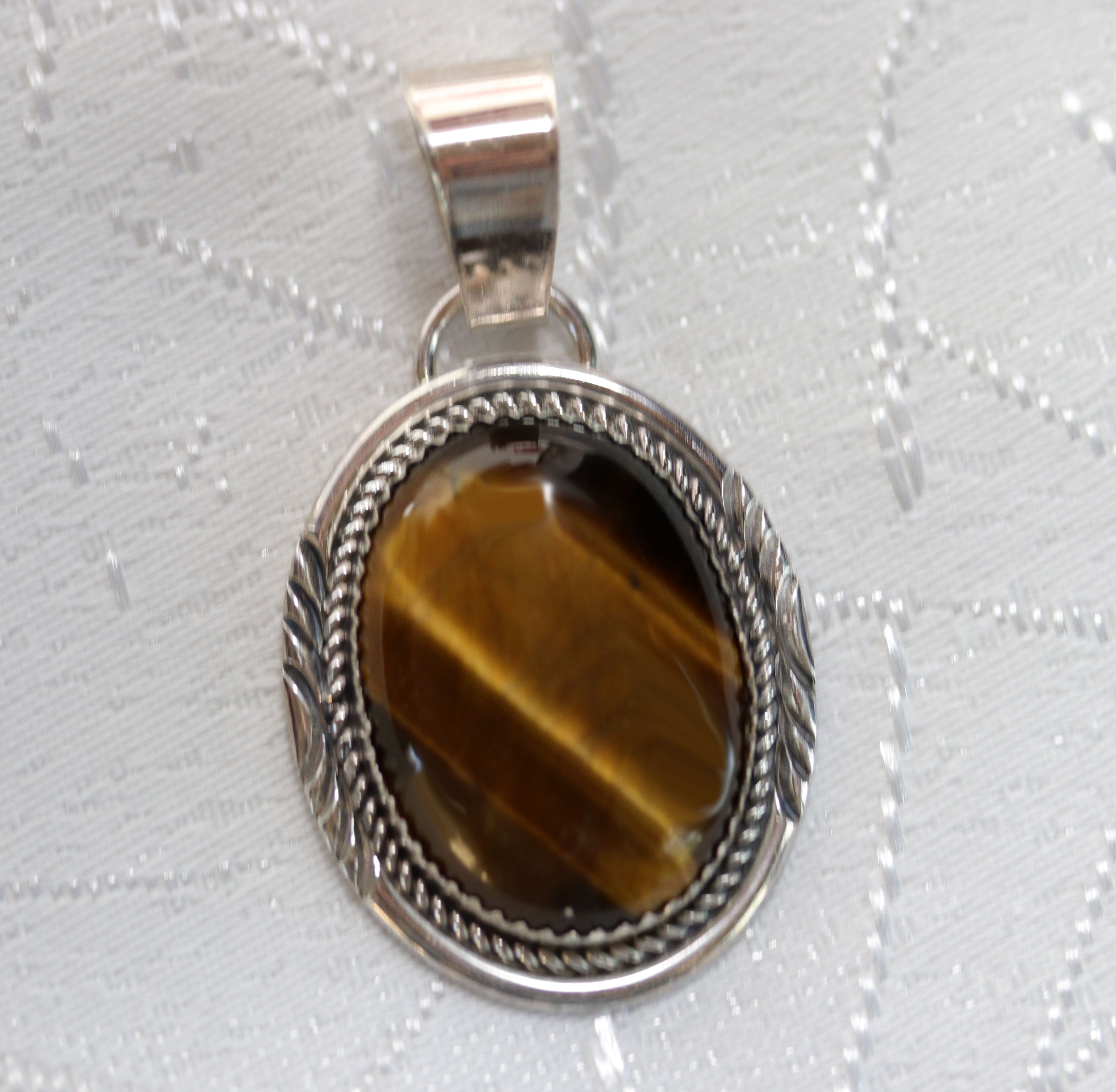 It is made from sterling silver and tiger eye. The pendant is about 2" in length and 1 1/16" in width.