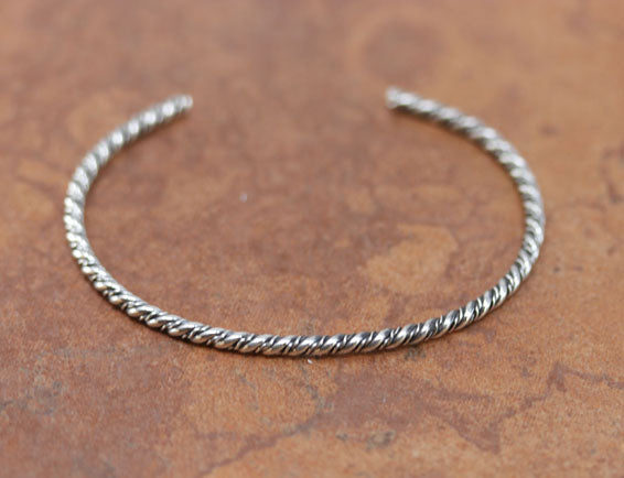 A lovely Navajo Native American bracelet. It is made from sterling silver. It is about 5 1/4" around and about 3/8" wide at the widest point. The opening is about 1", and partly flexible.