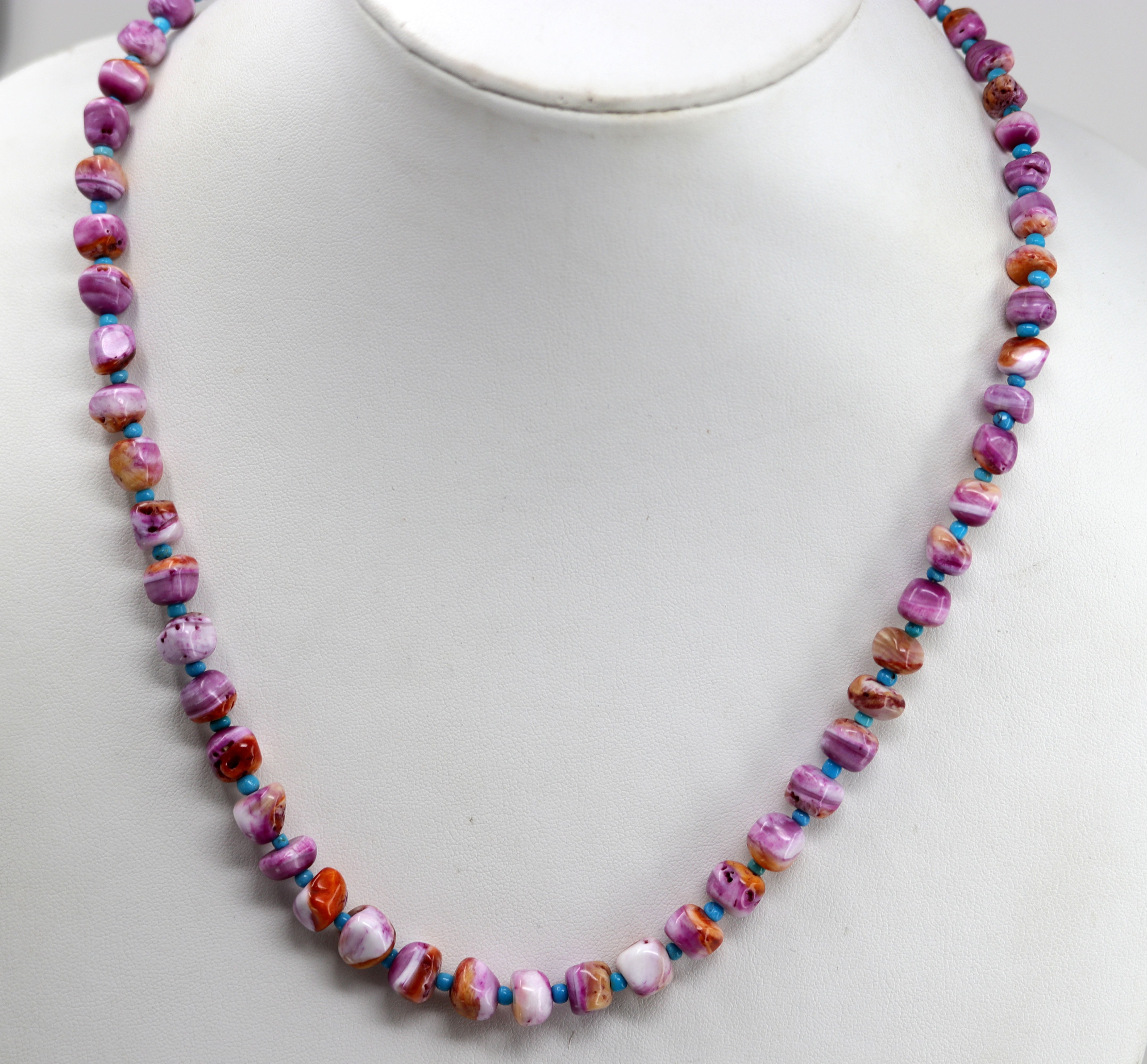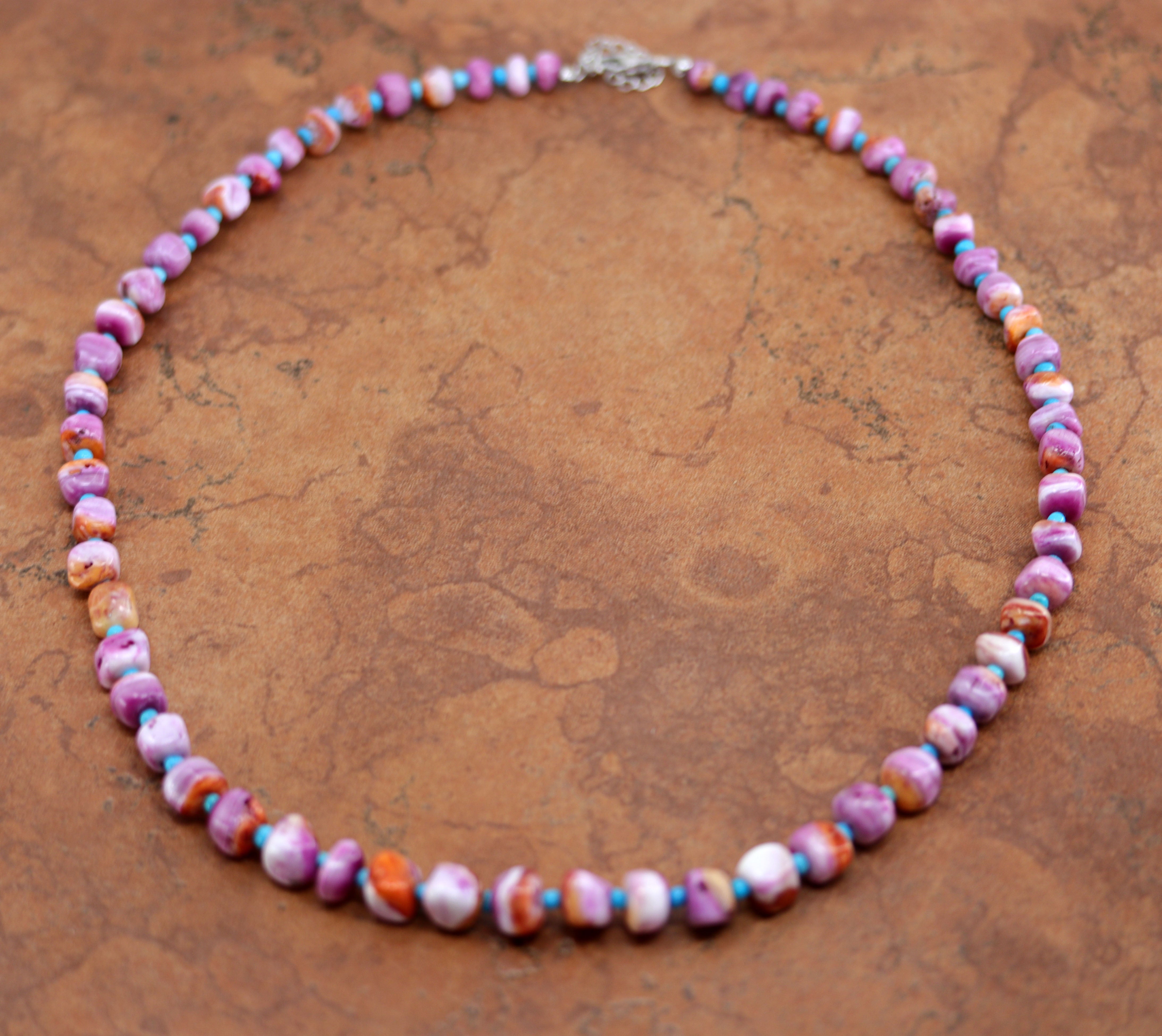 A beautiful lightning bolt. It is made from sterling silver and cotton candy dahlia. The necklace is about 22" in length (with a 2" extender). The width measures 3/8". This item is not Native American.