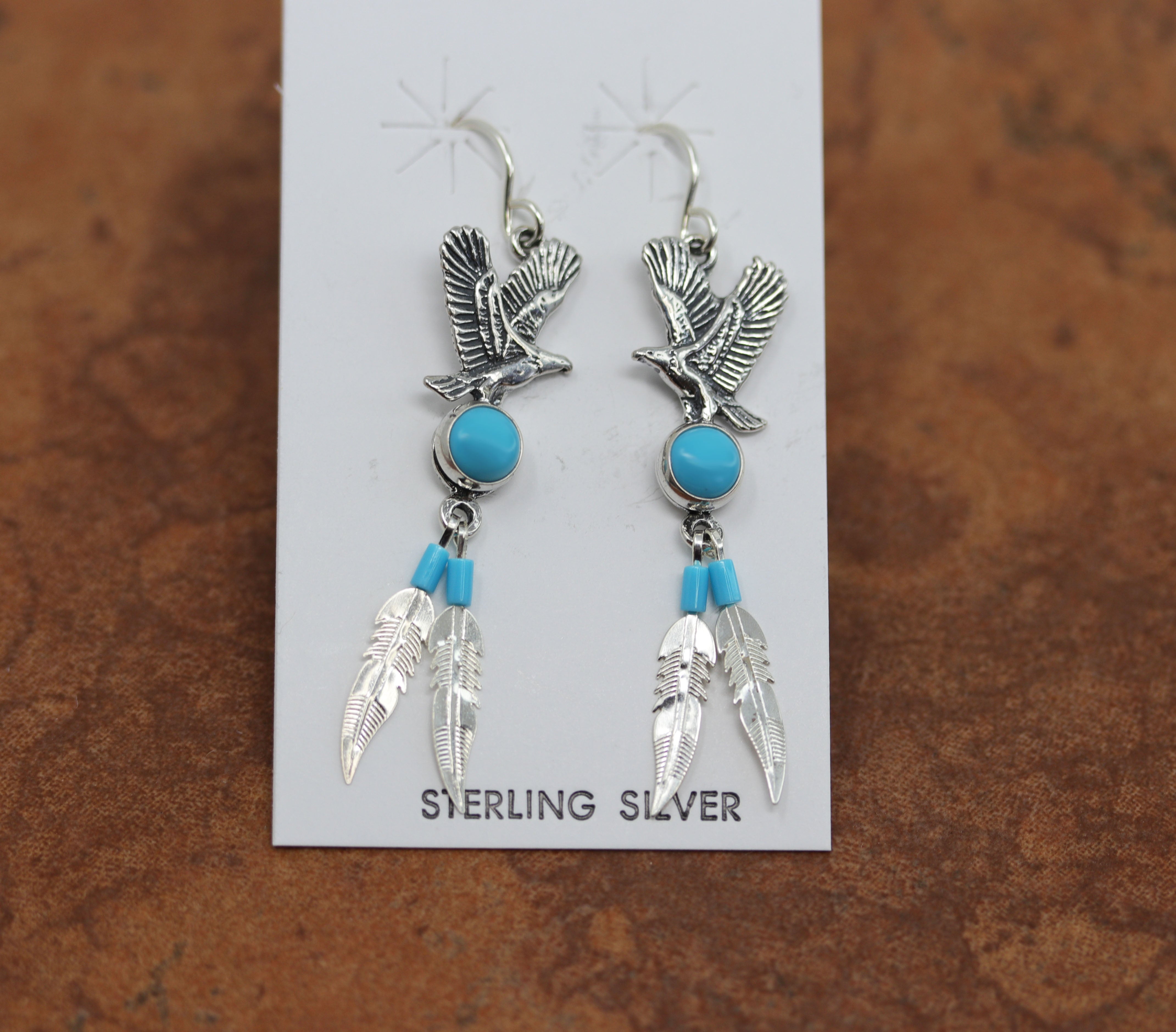 Beautiful sterling silver eagle earrings. The earrings are about 2 1/4" in length including the hook and 3/8" wide at the widest point. This item is not Native American.