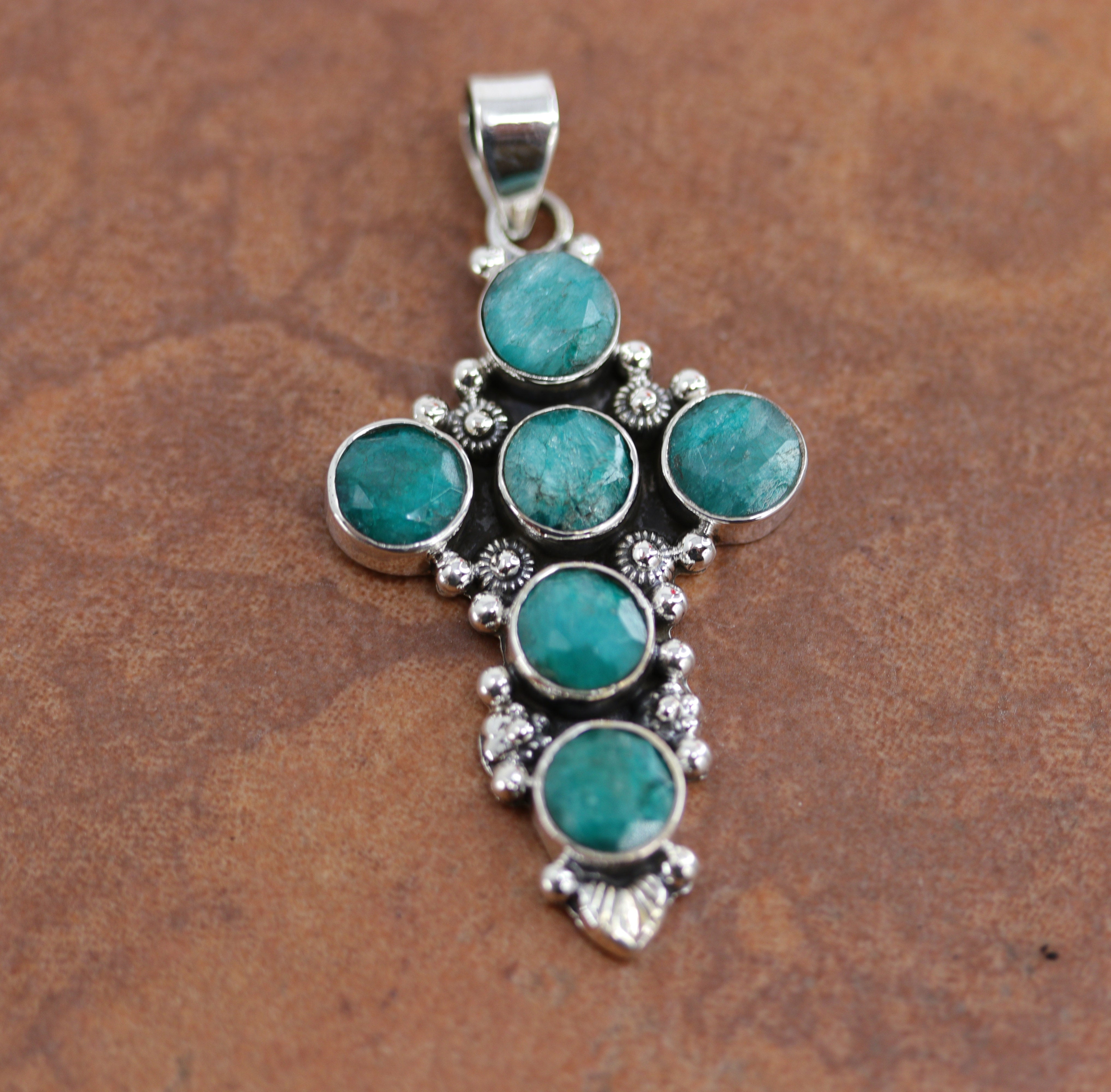 It is made from Sterling Silver and emerald. It is about 2 1/8" in length including the bail, and about 1 1/8" in width. This item is not Native American.