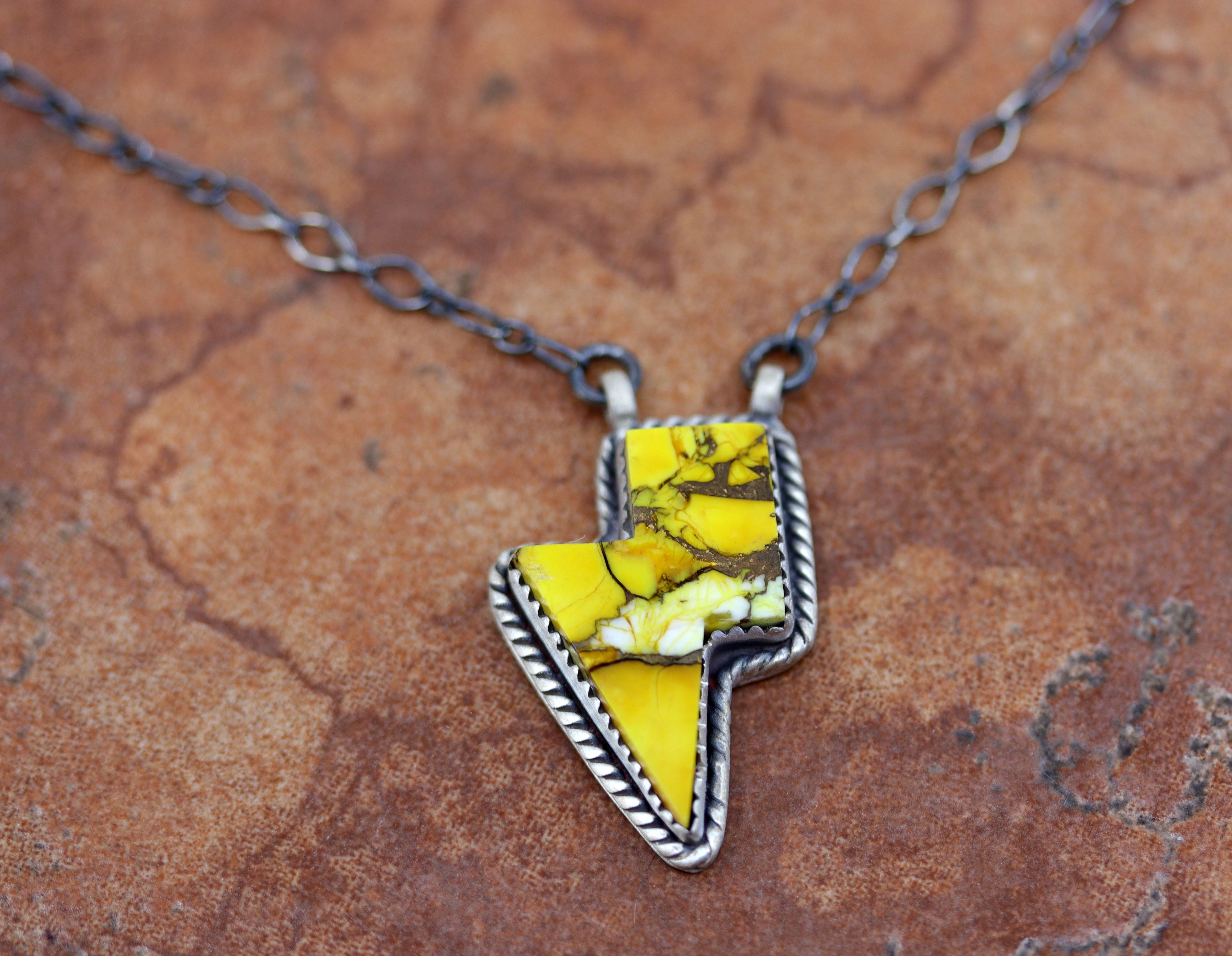 A beautiful lightning bolt. It is made from sterling silver and honey dahlia. The necklace is about 20" in length. The center pendant measures 1 3/8" by 7/8". This item is not Native American.